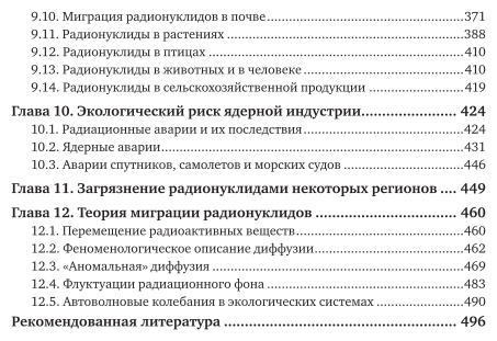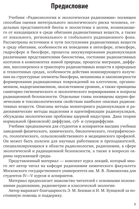 В книге представлены методы оценки интегрального экологического риска, связанного с использованием радионуклидов и (или) испускаемых ими ионизирующих излучений. Приведены некоторые сведения по радиоактивности, ионизирующим излучениям, ядерно-физическим свойствам наиболее опасных радиоактивных изотопов и способам расчета радиационных доз, получаемых человеком, населением и популяцией. Рассмотрены источники поступления радионуклидов в различные компоненты среды обитания и дан анализ современного загрязнения радионуклидами почв, атмосферы, воды, растений и животных. Обсуждены методы математического описания процессов миграции радиоактивных веществ. Соответствует актуальным требованиям Федерального государственного образовательного стандарта высшего образования. Учебник может быть использован для подготовки студентов бакалавриата и магистратуры в области радиоэкологии, охраны окружающей среды, радиоэкологической безопасности и экологической радиохимии.