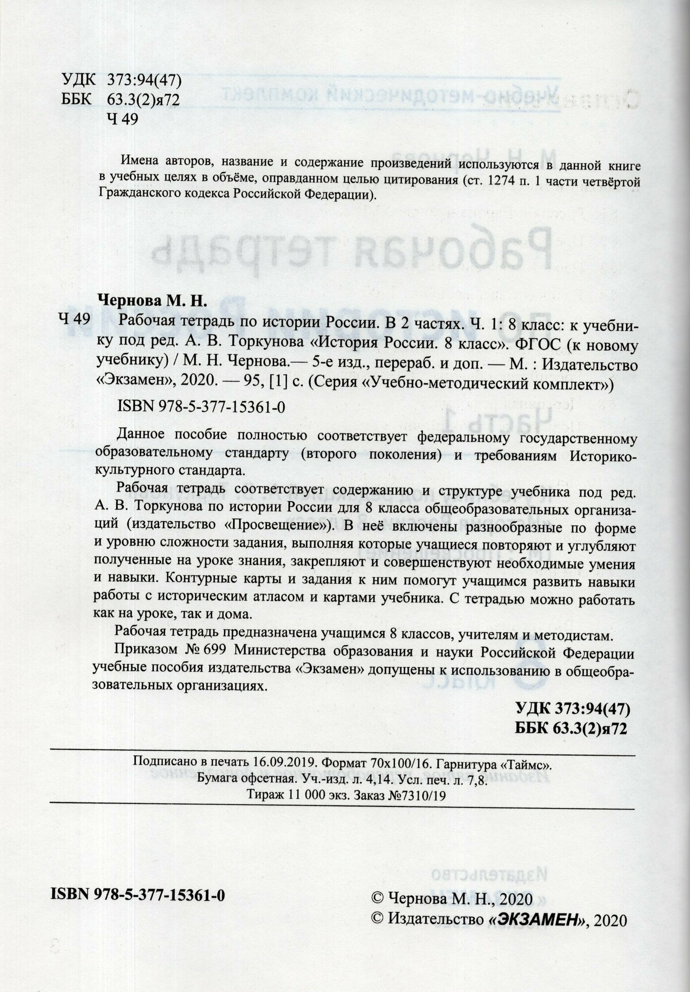 Рабочая тетрадь по истории России 8 класс Часть 1 К учебнику под редакцией А В Торкунова История России 8 класс (Марина Николаевна Чернова); Экзамен, 2018