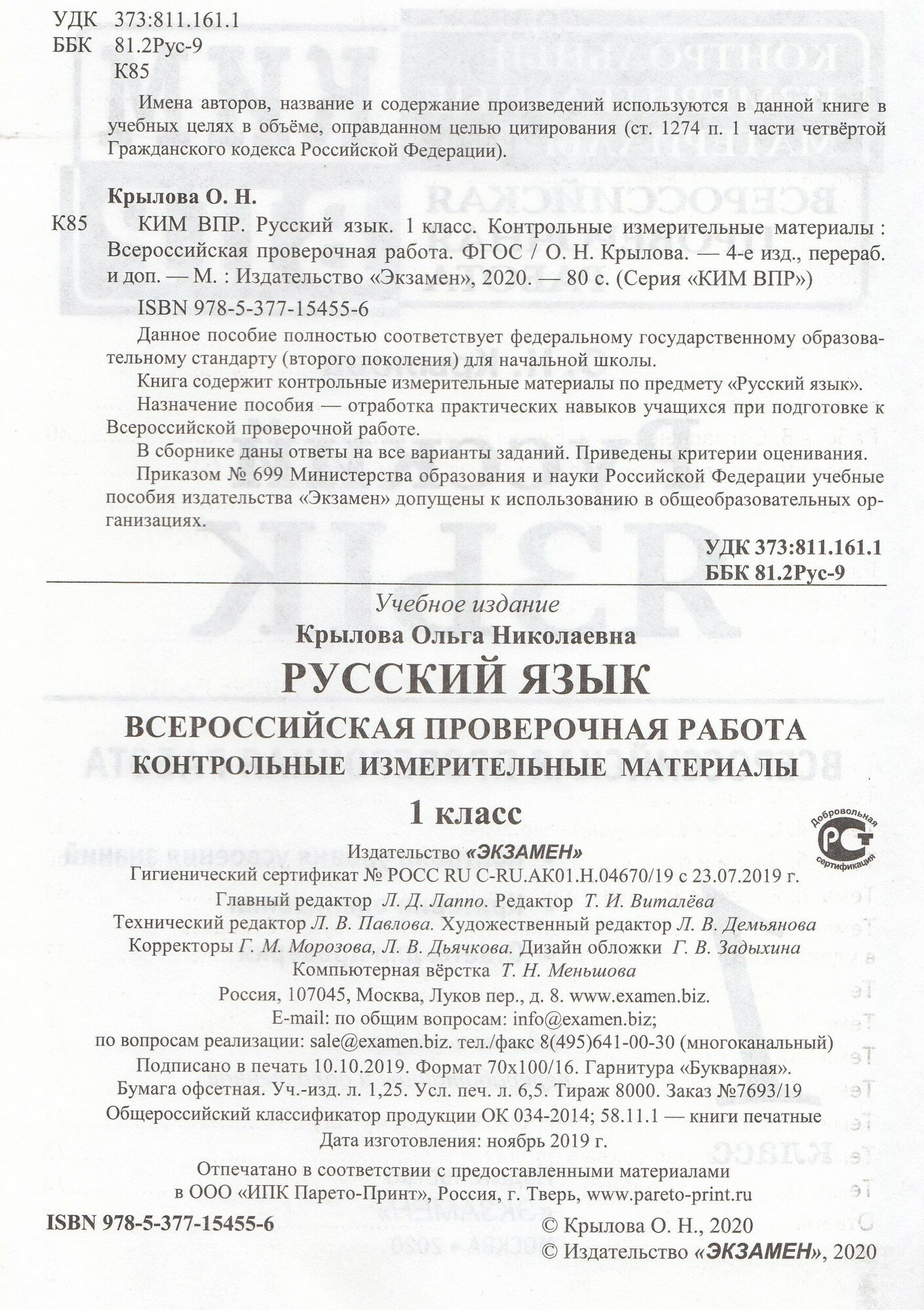 Русский язык 1 класс Контрольно-измерительные материалы Всероссийская проверочная работа (Ольга Николаевна Крылова); Экзамен, 2020