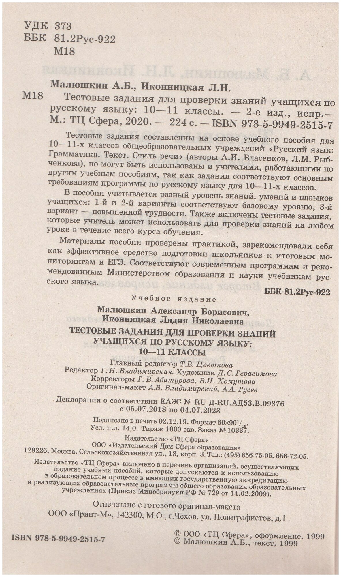 Тестовые задания для проверки знаний учащихся по русскому языку 10-11 классы (Малюшкин А., Иконницкая Л.); Творческий центр Сфера Издательство, 2020