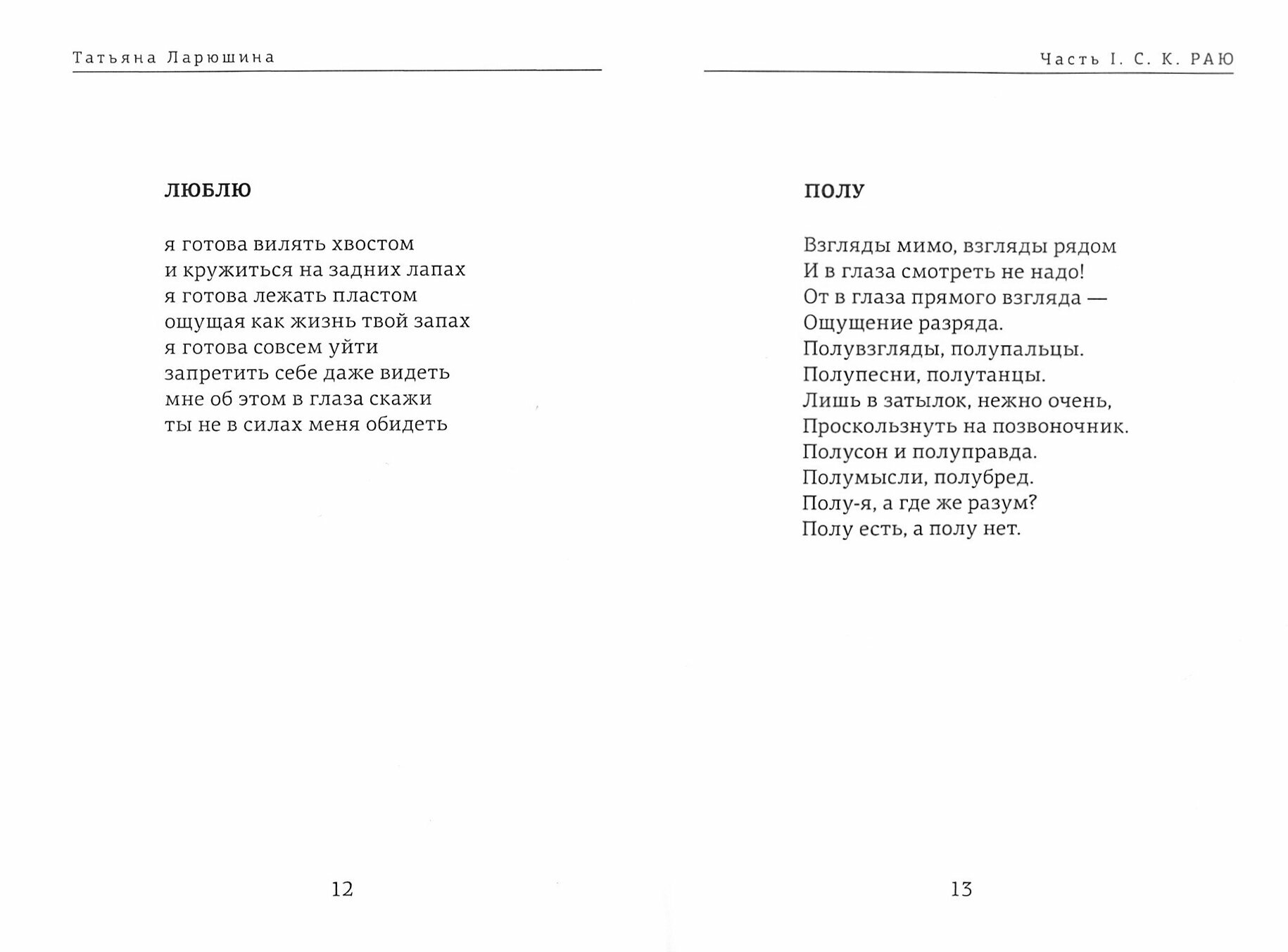 В Татьяне Ларюшиной есть особая внутренняя сила, гибкий стальной стержень, который позволяет ей выдерживать любые нагрузки, и прежде всего собственную остроту переживания самых простых вещей. Мы всегда поручаем Ларюшиной самое трудное. Мы знаем, что и жизнь ее - далеко не пряник. И она молчит и делает - это у нее стиль такой. Вот и стихи у нее про то, как человек, начисто лишенный любых защитных механизмов, собранно и твердо идет сквозь жизнь, и встречает столкновение с любовью, и проживает эту любовь полной мерой. Все это делается без позерства и криков, с той честностью, решимостью и простотой, какую называют русским характером. Как бы ни компрометировали это понятие, оно есть. Вот он, этот характер, перед вами.