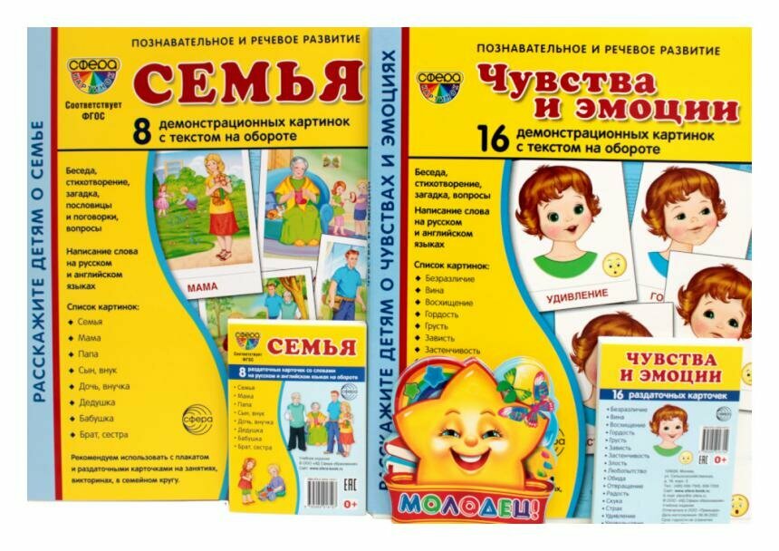 Сервис сравнения цен СкидкаГИД предлагает сравнить цены на товар «Книга: Демонстрационные картинки СУПЕР Семья чувства и эмоции комплект из 2-х наглядных материалов в папках 2 набора карточек (Цветкова Татьяна Владиславовна, Цветкова Татьяна Константиновна); ТЦ Сфера, 2020»