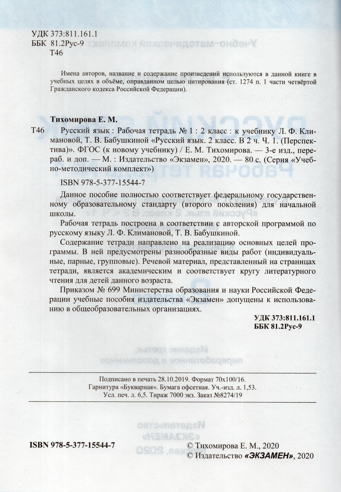 Русский язык 2 класс Рабочя тетрадь 1 К учебнику Л Ф Климановой Т В Бабушкиной Русский язык 2 класс В 2-х частях (Елена Михайловна Тихомирова); Экзамен, 2019
