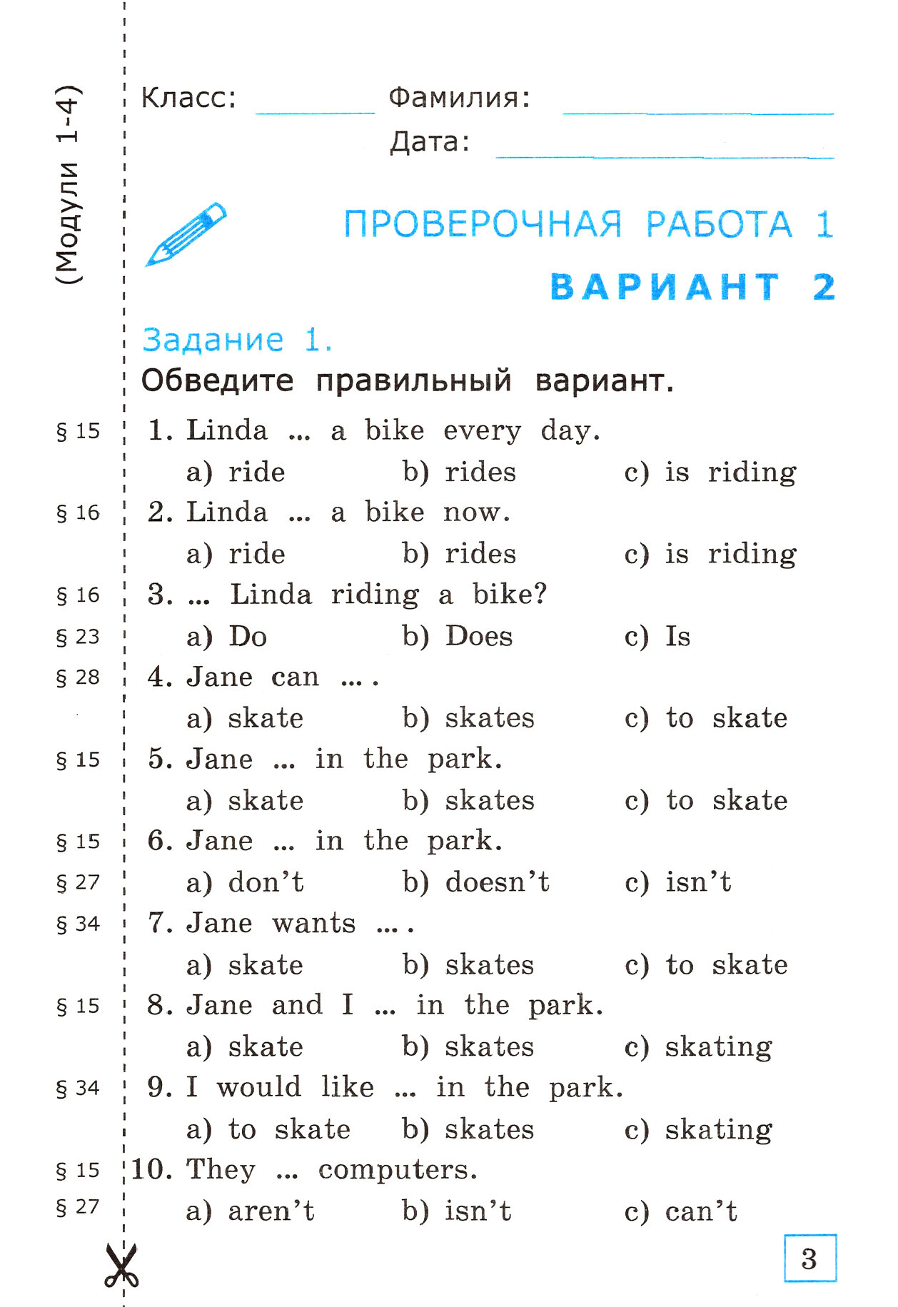 В пособие включены проверочные задания для контроля усвоения грамматического материала четвёртого класса. Проверка проводится в конце каждой четверти. Каждая работа имеет четыре варианта. Дома учащиеся готовятся к проверочной работе, просматривая все четыре варианта. На уроке преподаватель сообщает, какой именно вариант следует сделать. Учащиеся выполняют задания, вырезают страницу из книжки и сдают её на проверку. Мы намеренно не дали ключи к заданиям. Тем, кто систематически делал упражнения из СБОРНИКА, выполнить предлагаемые работы не составит труда. Если при подготовке всё же возникнут сложности, то прочитать соответствующее правило и найти ответ можно в КНИГЕ ДЛЯ РОДИТЕЛЕЙ. Номер соответствующего параграфа указан рядом с каждым заданием. Проверочные работы можно использовать и в дидактических целях. Для учащихся 4 класса, изучающих английский язык.
