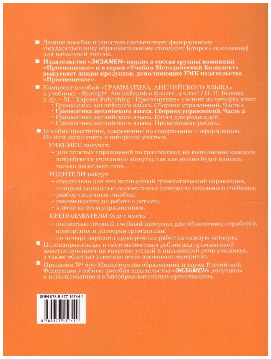 Грамматика английского языка 4 класс Сборник упражнений Часть 2 К учебнику Н И Быковой и др Spotlight Английский в фокусе 4 класс (Барашкова Елена Александровна); Экзамен Издательство, 2021