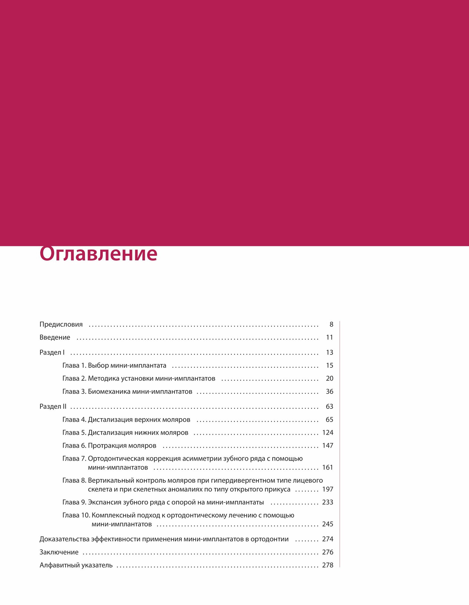 Книга посвящена использованию в ортодонтии мини-имплантатов в качестве опорных точек перемещения зубов. Общий раздел посвящен вопросам биомеханики мини-имплантатов, их выбору и установке. Далее детально описываются пошаговые протоколы коррекции нарушений окклюзии при помощи несъемных аппаратов и эластических тяг с опорой на мини-имплантаты. В частности освещены вопросы дистализации и мезиализации моляров с контролем положения резцов, коррекции асимметрии зубных рядов, скелетных аномалий по типу открытого прикуса у пациентов с гипердивергентным типом лицевого скелета. В книге приводятся протоколы коррекции как для растущих пациентов, так и для взрослых с детальным разъяснением биомеханического обоснования лечения.