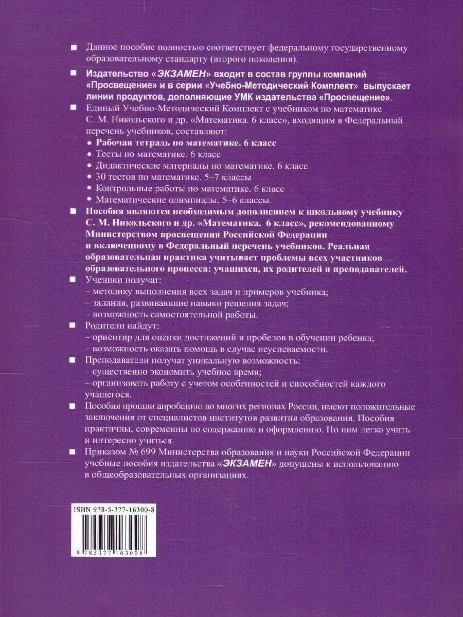 Рабочая тетрадь является необходимым дополнением к школьному учебнику С. М. Никольского и др. "Математика. 6 класс" (издательство "Просвещение"), рекомендованному Министерством просвещения Российской Федерации и включенному в Федеральный перечень учебников.