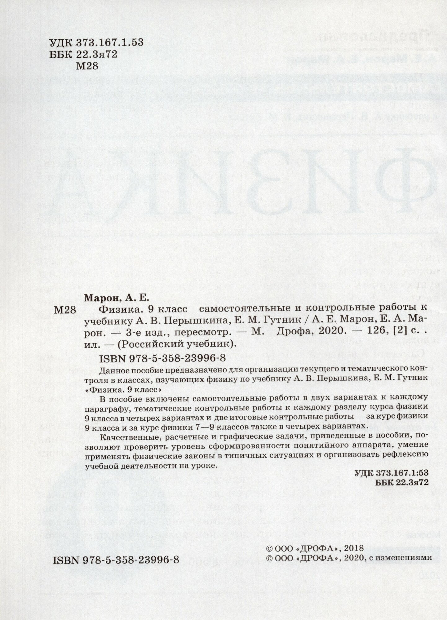 Физика 9 класс Самостоятельные и контрольные работы к учебнику А В Перышкина Е М Гутник (Абрам Марон); Дрофа, 2020