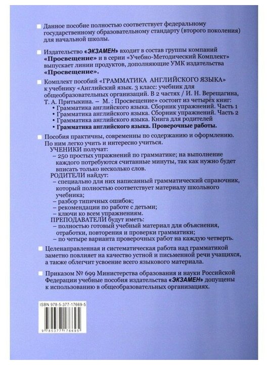 Сервис сравнения цен СкидкаГИД предлагает сравнить цены на товар «Книга: Грамматика английского языка 3 класс Проверочные работы К учебнику И Н Верещагиной Т А Притыкиной English 3 (Елена Александровна Барашкова); Экзамен, 2021»