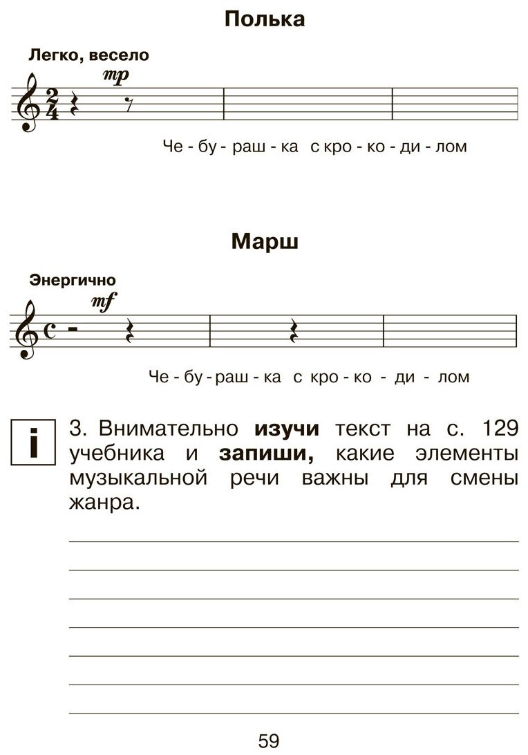 Тетрадь к учебнику «Музыка» авторов Т. В. Челышевой, В. В. Кузнецовой является частью учебно-методического комплекта системы «Перспективная начальная школа». Тетрадь способствует освоению содержания учебника, создаёт условия для выполнения помещённых в него заданий, а также содержит дополнительные сведения и задания, направленные на раскрытие учебных тем. Работа с тетрадью предполагает разные виды учебной деятельности, включая использование информационных технологий, нотной записи музыкальных произведений, работу со словарём, творческую деятельность на уровне метапредметности.