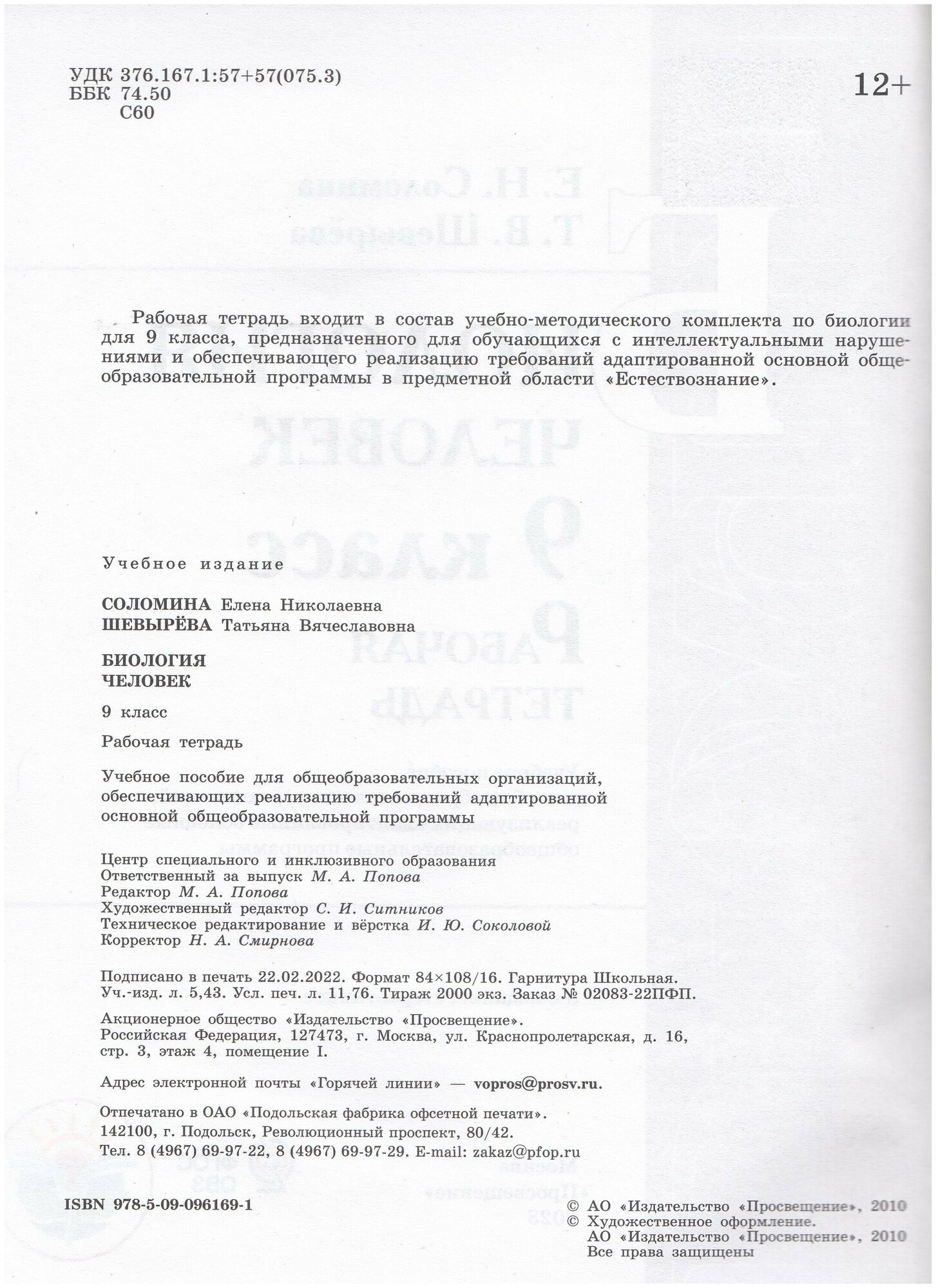 Биология Человек 9 класс Рабочая тетрадь Учебное пособие для общеобразовательных организаций обеспечивающих реализацию требований адаптированной основной общеобразовательной программы (Татьяна Вячеславовна Шевырева, Елена Николаевна Соломина); Просвещение, 2021