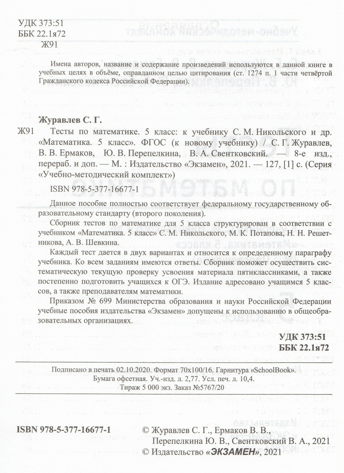 Тесты по математике 5 класс К учебнику С М Никольского и др Математика 5 класс (Журавлев Сергей Георгиевич, Свентковский Владимир Анатольевич, Перепелкина Юлианна Вячеславовна, Ермаков Виктор Викторович); Экзамен Издательство, 2019