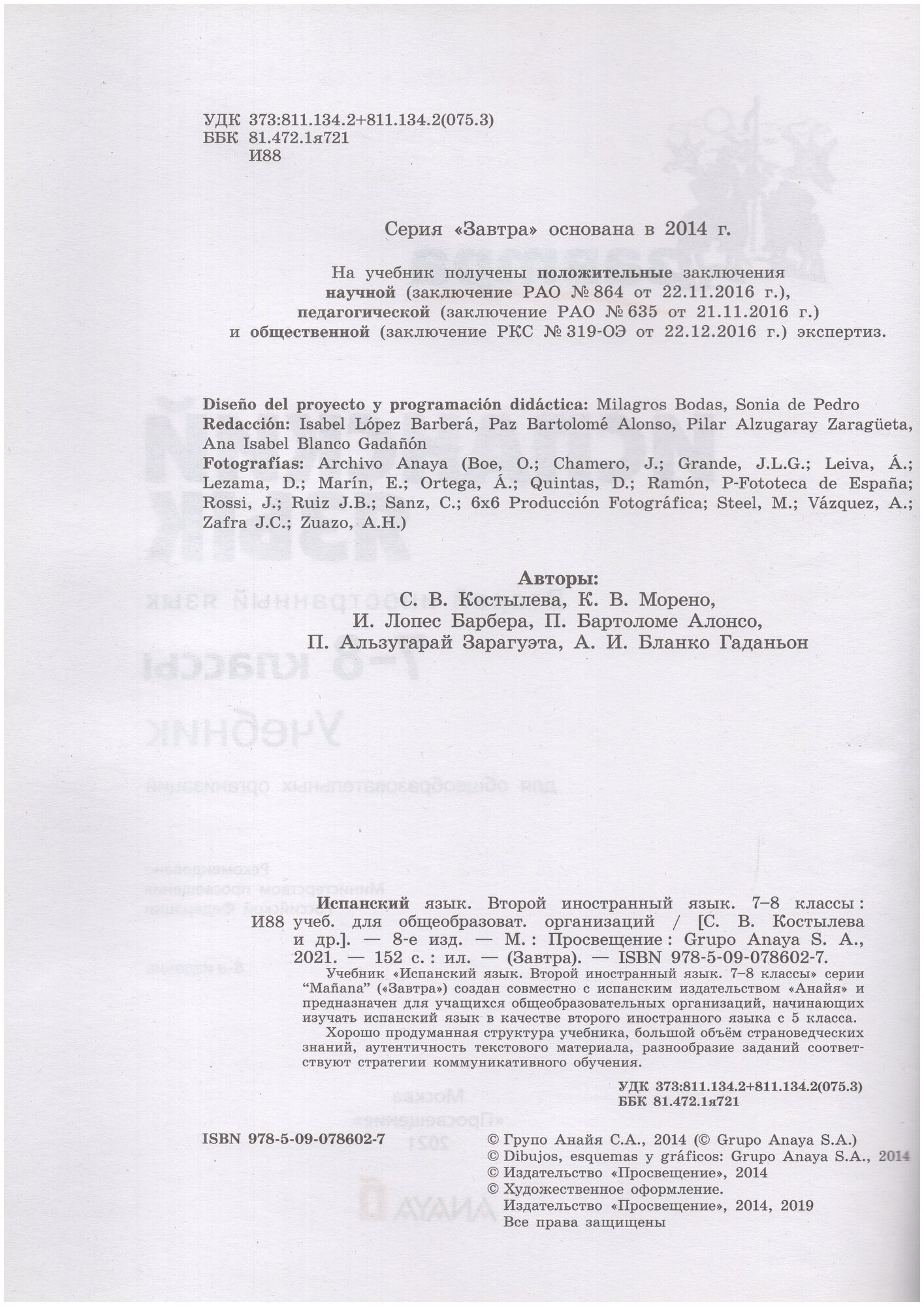 Испанский язык Второй иностранный язык 7-8 классы Учебник (Костылева С.); Просвещение, 2020