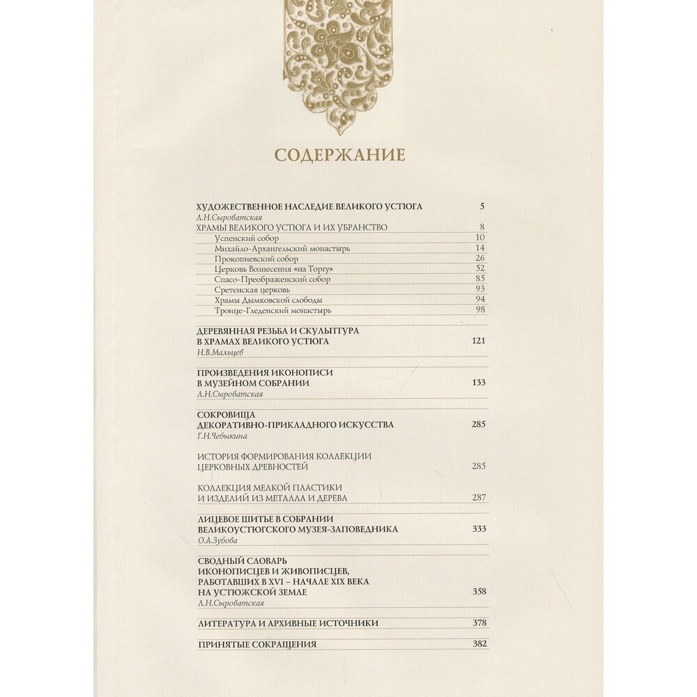 Первая наиболее полная публикация произведений древнерусской живописи и церковного декоративно-прикладного искусства, находящихся в собрании Великоустюгского музея-заповедника. Самобытность одного из ярких культурных центров Русского Севера прослежена на примере его богатейшего художественного наследия в архитектуре, стенописи, иконописи, мелкой пластики, предметах храмовой утвари и лицевого шитья. Приводятся стилистическая особенность и приемы деревянной резьбы и скульптуры при их использовании для убранства храмов Великого Устюга.