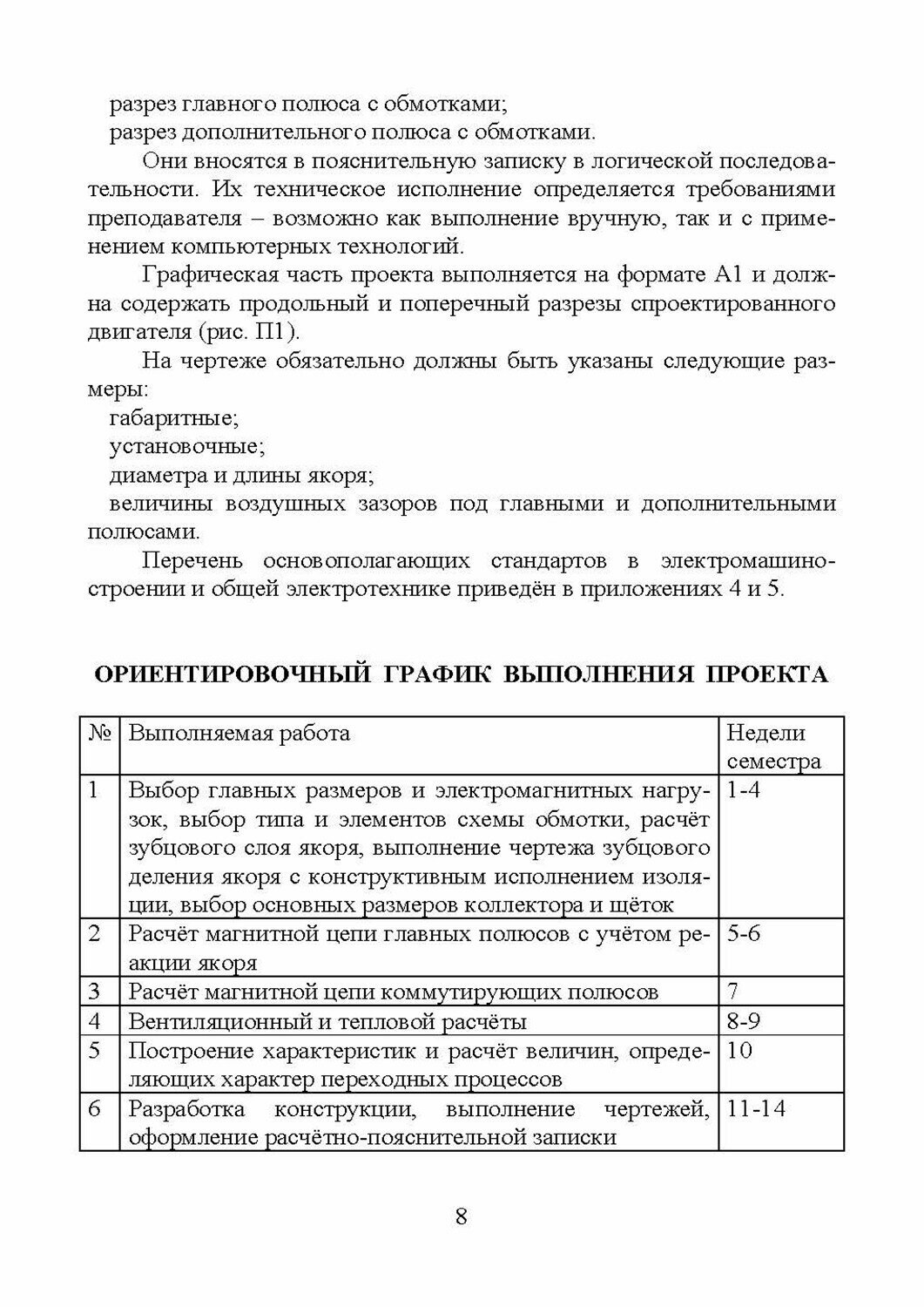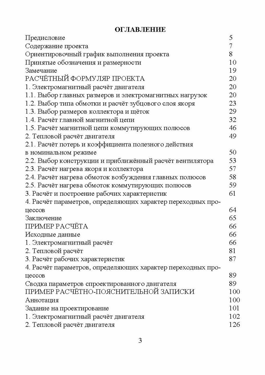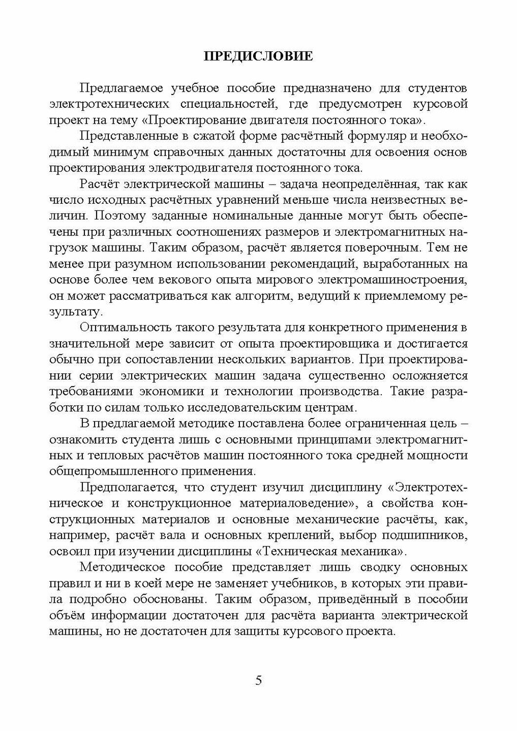 Предлагаемое учебное пособие включает в себя минимальную информацию, достаточную для освоения основ проектирования электродвигателя постоянного тока, и состоит из трёх основных разделов. В первом из них содержится расчётный формуляр проекта, состоящий из электромагнитного и теплового расчётов двигателя, расчёта и построения рабочих характеристик и параметров, определяющих характер переходных процессов. Во втором разделе приведены пример расчёта двигателя и сводка всех его параметров, позволяющая приступить к выполнению графической части проекта. Третьим разделом является пример оформления пояснительной записки и чертежей.