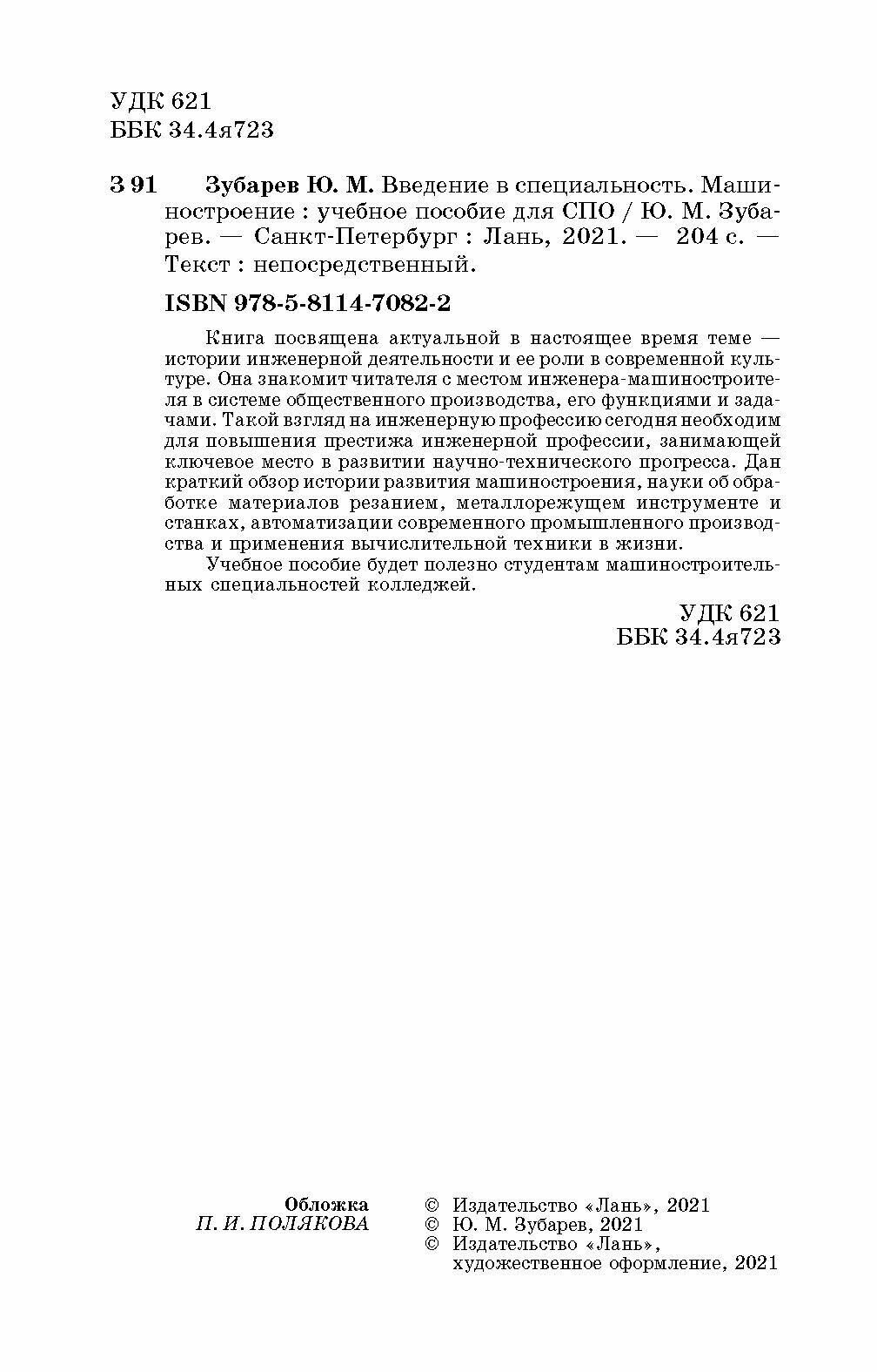 Введение в специальность Машиностроение (Ю. М. Зубарев); Издательство ЛАНЬ, 2021