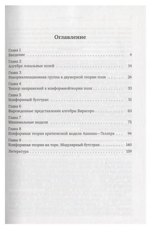 В книге дан обзор современного состояния двумерной конформной теории поля и ее применений к физике критических явлений в двумерных системах. Последовательно развивается бутстрапный подход к конформной теории поля, основанный на операторной алгебре. Детально рассмотрен ряд точных решений теории, включающий «минимальные модели» с с < 1 и параметрическое семейство моделей с с = 1. Эти модели описывают критические и мультикритические точки различных двумерных статистических систем, среди которых наиболее известными являются модель Изинга, трехпозиционная модель Поттса и модель Ашкина—Теллера. Также обсуждается альтернативный подход к конформной теории поля, основанный на модулярной инвариантности тороидальной статистической суммы («модулярный бутстрап»).