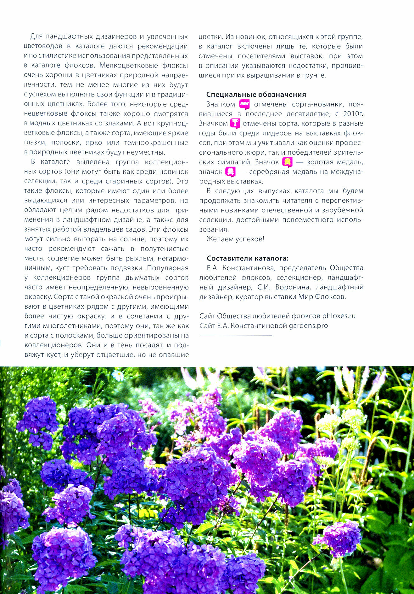 Данное издание продолжает серию каталогов Общества любителей флоксов, призванную знакомить читателя с основным и перспективным сортиментом флокса метельчатого. Составители, селекционер флоксов и ландшафтный дизайнер Елена Константинова и ландшафтный дизайнер, куратор выставки Мир Флоксов Светлана Воронина, в третьем выпуске каталога предлагают вниманию читателя материал для изучения, включающий не только качественные иллюстрации и описания сортов, но и рекомендации для их приме-нения в озеленении. В данный выпуск также добавлены новые главы об истории флоксоводства, а описания классических отечественных и зарубежных сортов скомпонованы так, чтобы читатель мог наиболее полно представить себе авторский почерк селекционеров. Издание предназначено для широкого круга читателей: цветоводов, коллекционеров, садовников, ландшафтных дизайнеров, селекционеров, питомниководов.