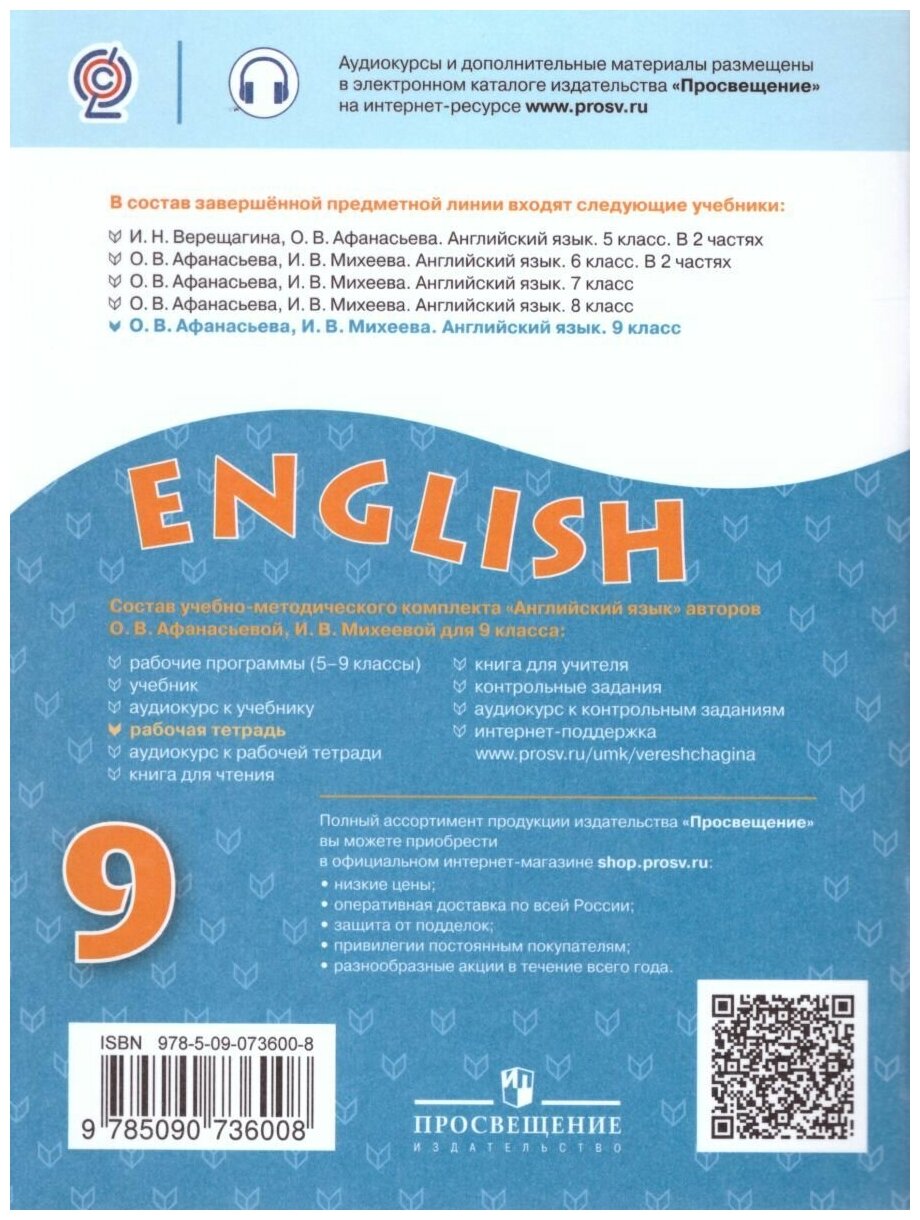 Рабочая тетрадь является составной частью учебно-методического комплекта по английскому языку для учащихся 9 класса общеобразовательных организаций и школ с углублённым изучением английского языка и включает упражнения для выполнения школьниками в классе и дома. Задания рабочей тетради направлены на тренировку учащихся во всех видах речевой деятельности (аудировании, говорении, чтении и письме) в рамках предлагаемой авторами тематики.
