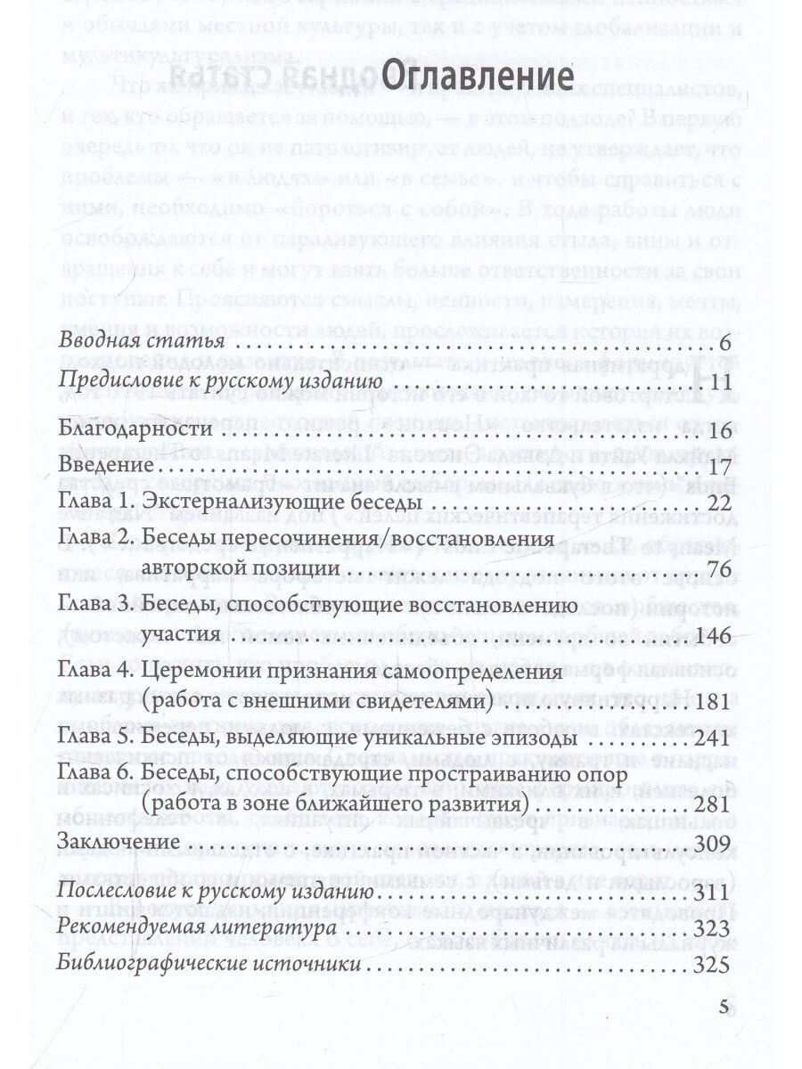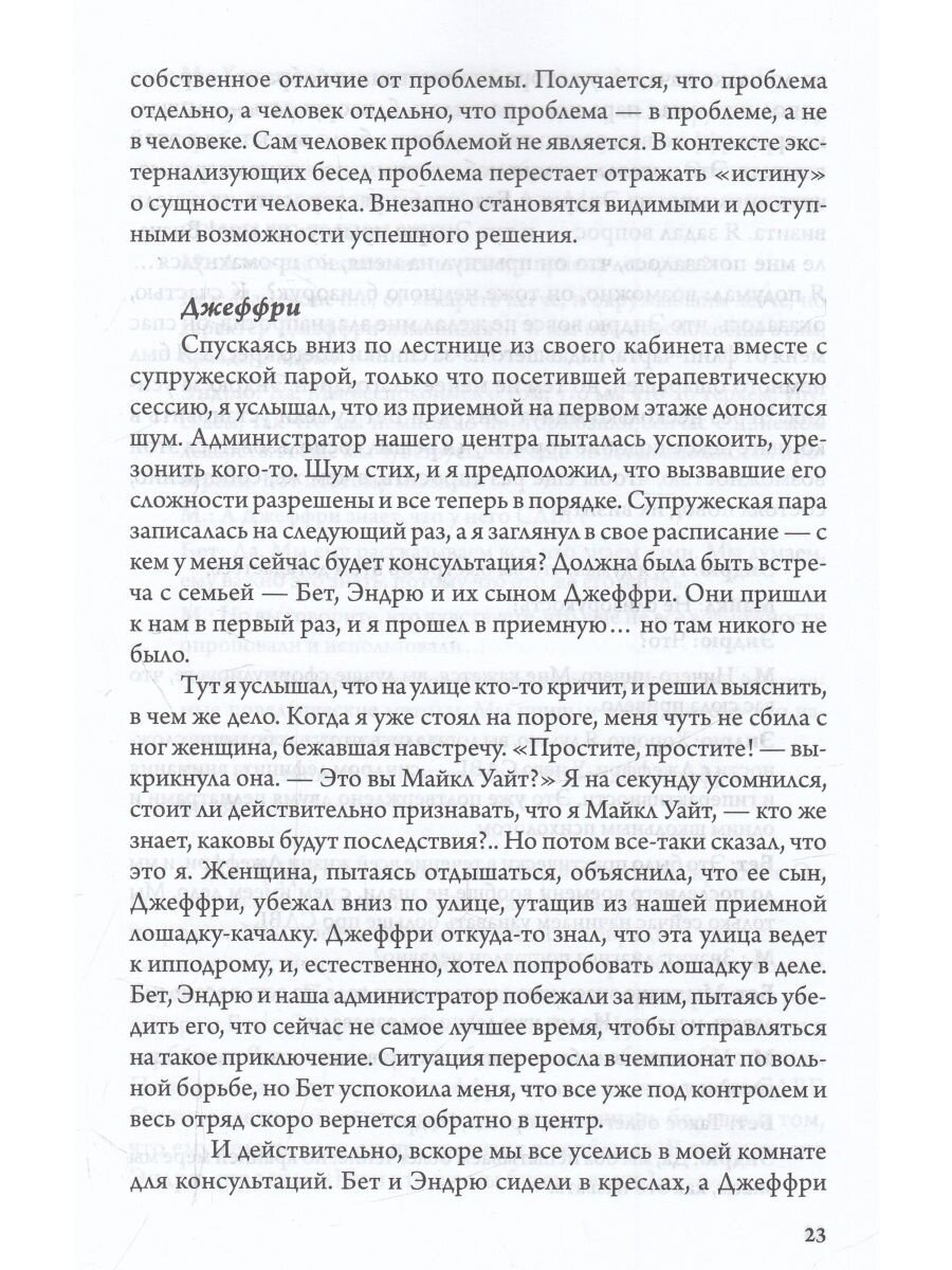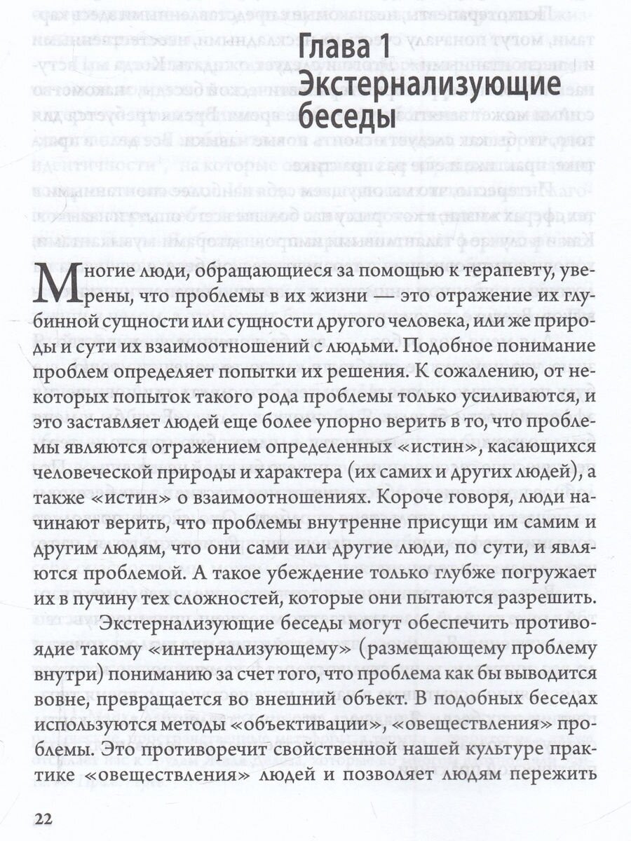 одно из первых русскоязычных изданий, в котором изложены основные идеи и принципы нарративного подхода в терапии – направления, которое стремительно завоевывает популярность в мире. В книге обобщен более чем двадцатилетний профессиональный опыт автора, подробно описаны основные приемы работы, приведены удивительные иллюстрации – стенограммы бесед и карты, позволяющие наглядно представить себе технику работы. Но этим ее ценность не ограничивается. Книга – из разряда мировоззренческих: она дает возможность взглянуть по-новому на проблемы человека и общества, на пути оказания терапевтической помощи людям. Это издание будет интересно как психотерапевтам – и начинающим, и опытным, так и всем думающим читателям.