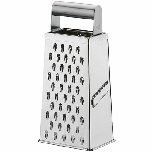 Терка имеет четыре стороны для измельчения продуктов: мелкая, крупная терки, терка для нарезки ломтиками и рефлеными ломтиками. Терка ломтиками оснащена двухсторонним лезвием для удобства нарезки в обоих направлениях. Удобная металлическая ручка. Может использоваться для мелкой, крупной тёрки и для тёрки картофеля. Материал: нержавеющая сталь. Можно мыть в посудомоечной машине. Размеры: 10,9*8,2*23,7 см. Срок годности не ограничен. БЕРЕЧЬ ОТ ДЕТЕЙ!