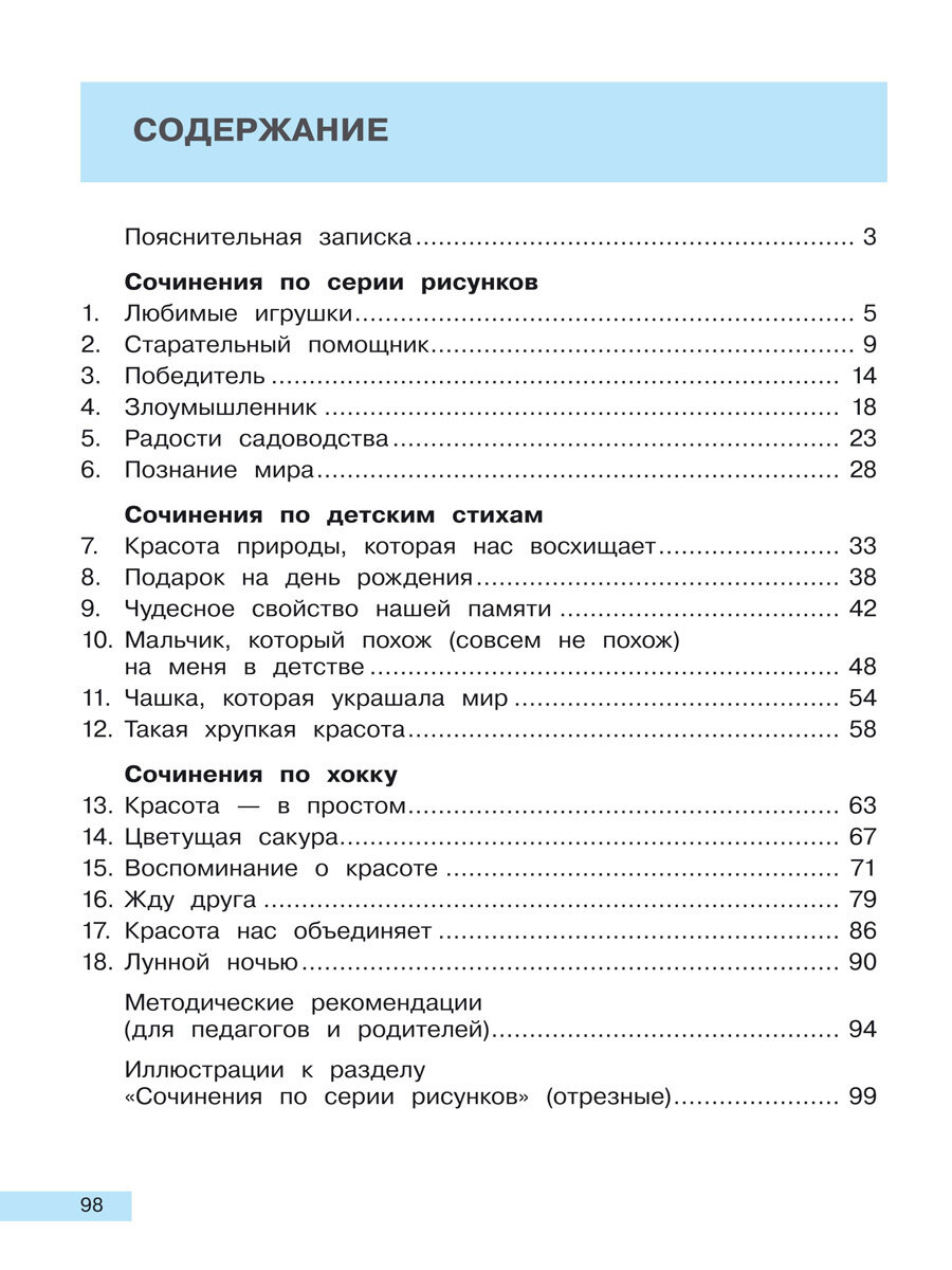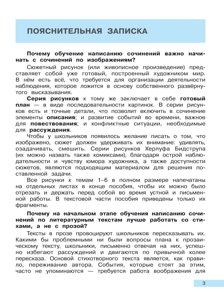 Пособие содержит 18 разработок к сочинениям: сюжеты для анализа (6 серий рисунков и 12 текстов), развёрнутые системы вопросов для устного обсуждения и подробные планы сочинений. Устная работа и письменные ответы на вопросы плана подготовят школьника к написанию сочинения с элементами описания, повествования и рассуждения. Материалы пособия помогут развитию наблюдательности и творческого воображения младших школьников, формированию у них связной речи, умения строить развёрнутые высказывания.