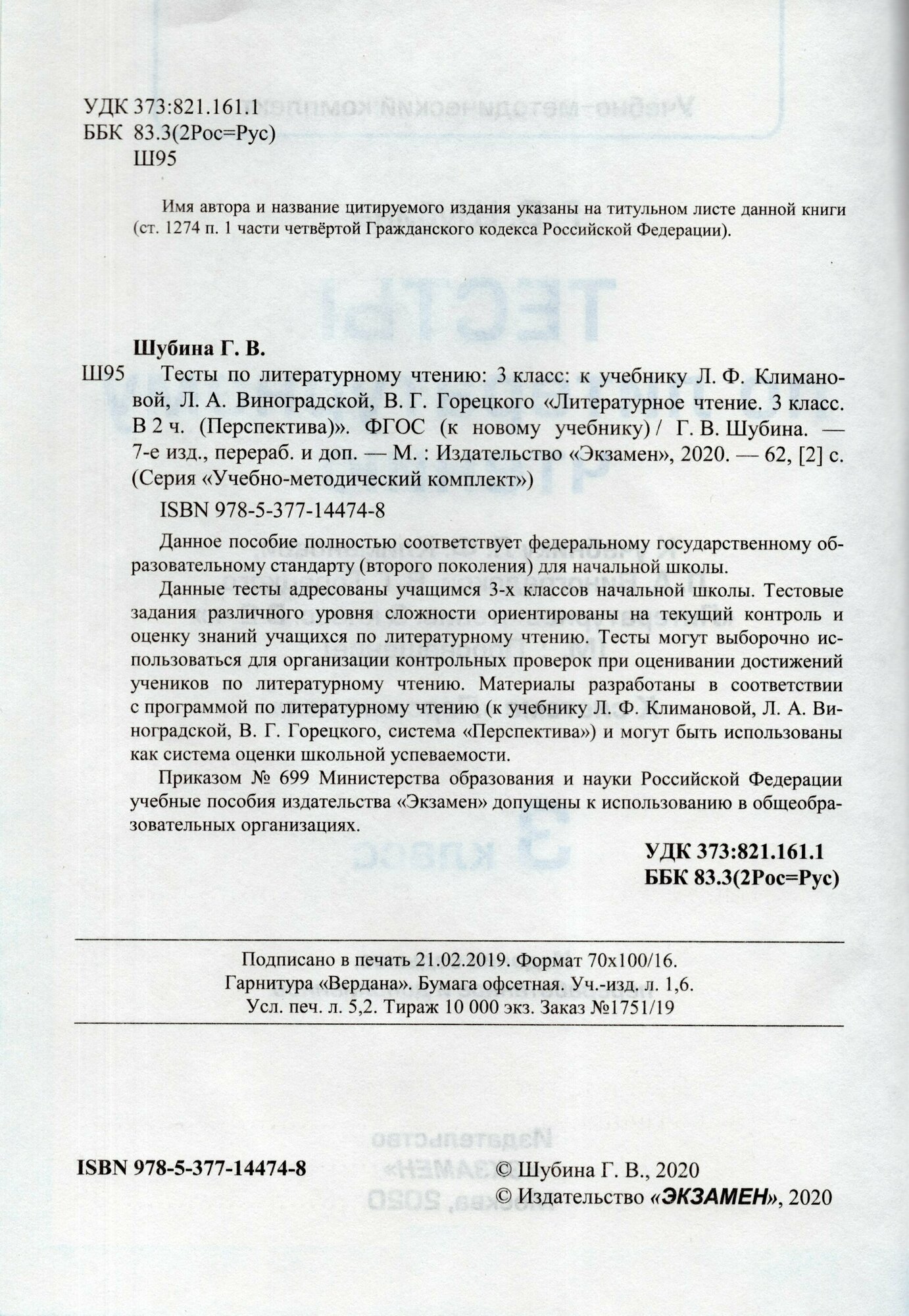 Тесты по литературному чтению 3 класс К учебнику Л Ф Климановой Л А Виноградской В Г Горецкого Литературное чтение 3 класс В 2 ч М Просвещение К системе Перспектива (Шубина Галина Викторовна); Экзамен, 2020