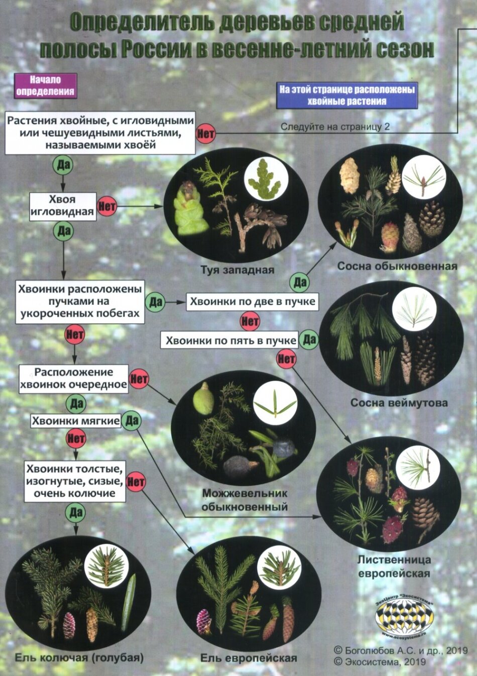 Определитель предназначен для определения наиболее распространенных деревьев, произрастающих в лесах, по окраинам полей, водоемов и болот. В основу системы определения положены особенности побегов, расположение, форма и размеры почек, наличие чечевичек, колючек, опушения, и другие морфологические признаки. В определитель включено 35 видов деревьев.Определитель предназначен для определения наиболее распространенных деревьев, произрастающих в лесах, по окраинам полей, водоемов и болот. В основу системы определения положены особенности побегов и листьев - их размеры, форма, опушение, жилкование и др. В определитель включено 37 видов деревьев.Основное назначение определителей - помочь начинающим исследователям природы (как юным, так и взрослым) узнавать правильные научные названия самых распространенных растений, произрастающих в средней полосе России (преимущественно на ее европейской территории).Наглядные определители предназначены для школьников, студентов, педагогов, специалистов ООПТ по экологическому просвещению, экскурсоводов, для родителей с детьми, для любителей природы всех возрастов.Данные определители являются тезисно-графическими дихотомическими определителями. Они представляют собой так называемую "бродилку" (по выражению современных детей), т.е. предполагают прохождение пути, обозначенного стрелками, от точки старта (на первой странице) до изображения искомого растения, с последовательными ответами "ДА" или "НЕТ" на вопросы о его внешнем морфологическом строении.Внешне, определители представляют собой сложенную вчетверо "гармошку" размером А4, при разворачивании раскладывающуюся в таблицу-раскладушку размером 84 х 30 см. Они напечатаны на плотной лакированной бумаге, защищенной от влаги.На лицевой стороне определителей расположены цветные изображения растений, полученные методом сканирования отдельных частей растения. Для каждого из видов растений в зимний сезон показаны участок побега с почкой крупным планом и внешний вид кроны (для деревьев). Для растений в летний сезон - внешний вид побега с листьями, лист крупным планом, соцветие/цветок и соплодие/плод крупным планом.На оборотной стороне определителей размещены справочники по морфологии древесных растений с зимний или летний сезоны года, а также краткие описания видов, включенных в определитель. "Справочники по морфологии" снабжены внутритекстовыми цветными иллюстрациями, демонстрирующими те или иные морфологические особенности растений, описываемые в тексте.