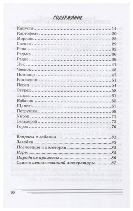 К предыдущей рецензии хочу добавить, что рассказ не ограничивается описанием овоща, историей его появления на нашем столе и использованием, но кое -где есть информация и об уходе за ним (например, говоря про картошку, автор пишет о колорадском жуке и способах борьбы с ним), есть история его наименования. В конце книги игры, задания, вопросы по теме, пословицы, приметы, поговорки.