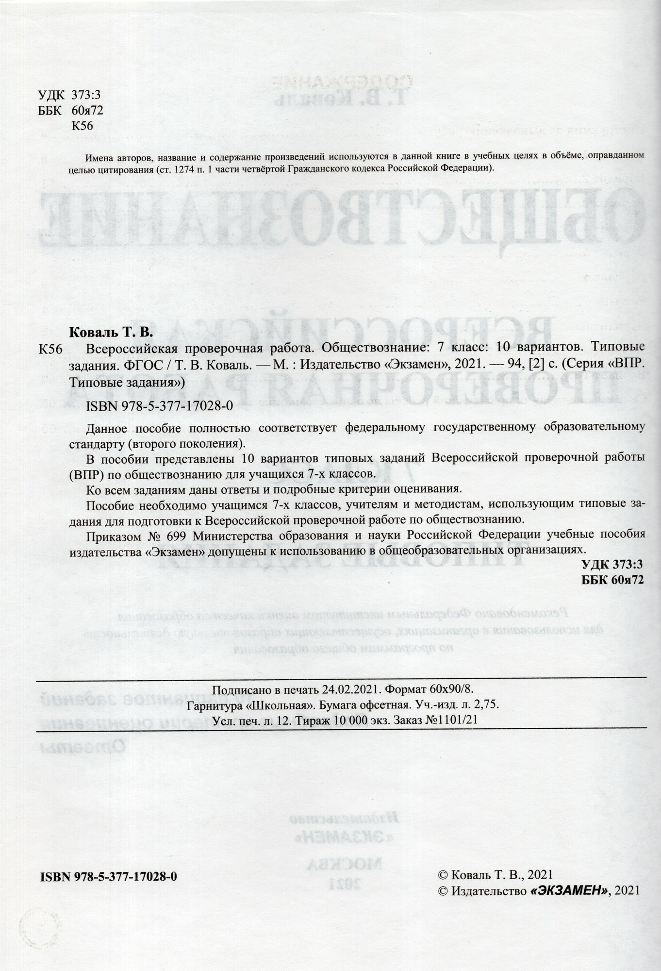 Обществознание Всероссийская проверочная работа 7 класс Типовые задания 10 вариантов заданий Подробные критерии оценивания Ответы (Коваль Татьяна Викторовна); Экзамен, 2025