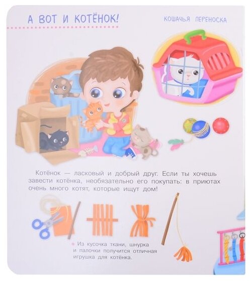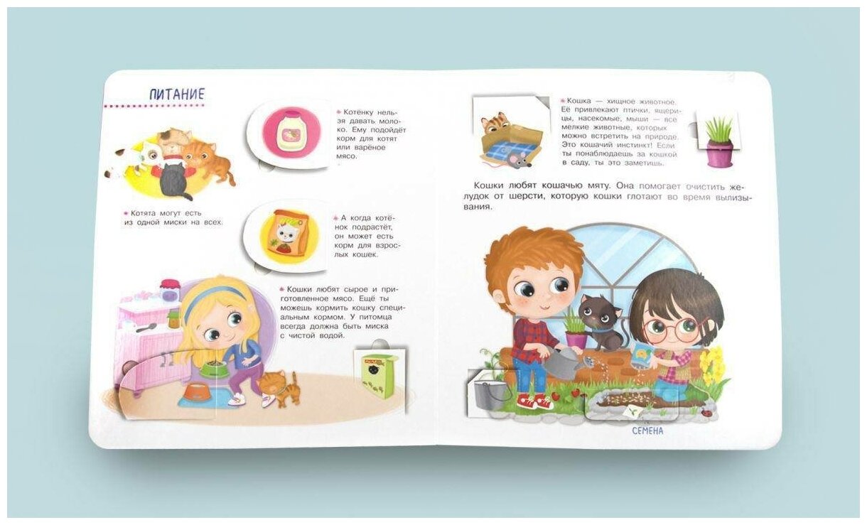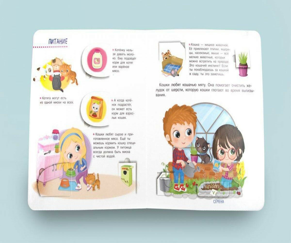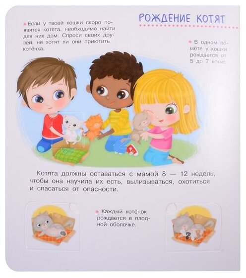 Хотя ребенок и не сильно тянулся к животным, решили купить, ведь в доме была кошка и хотелось объяснить сыну некоторые правила поведения с кошками и вообще о них. Для первой энциклопедии очень подошла эта книга: плотный картон, много окошек, яркие иллюстрации, несложный материал. Конечно, больше всего понравились ребёнку окошки. Котята нарисованы очень милыми, можно даже сказать - нарочито