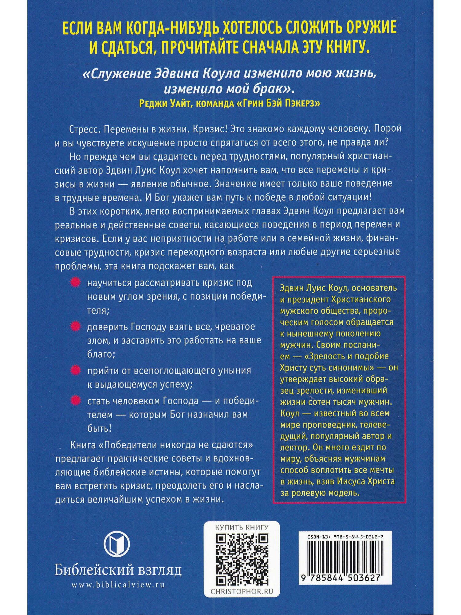Стресс. Перемены в жизни. Кризис! Это знакомо, пожалуй, каждому человеку. Возможно и вам порой так хочется просто спрятаться от всего этого, не правда ли? Но перед тем, как вы сдадитесь перед трудностями, христианский автор Эдвин Луис Коул хочет напомнить вам, что все перемены и кризисы в жизни — явление обычное. Ваша позиция и ваше поведение в трудные времена и определяют в победе вы или в поражении. Бог укажет вам путь к победе в любой ситуации! В этих небольших, легко воспринимаемых главах Эдвин Коул предлагает вам реальные и действенные советы, которые касаются поведения в период кризиса и перемен. Если у вас трудности на работе, в семейной жизни, проблемы в финансовой сфере, кризис переходного возраста или любые другие сложные серьезные вопросы, то эта книга подскажет вам, как научиться рассматривать кризис под новым углом зрения, с позиции победителя; довериться Господу и отдать Ему все проблемы, за которыми стоит зло, и заставить это работать на ваше благо; прийти от всепоглощающего уныния к выдающемуся успеху; стать Божьим человеком — победителем, которым Бог предназначил вам быть. В книге «Победители никогда не сдаются» предложены практические советы и вдохновляющие библейские истины. Они помогут вам встретить кризис, преодолеть его и насладиться величайшим успехом в вашей жизни.