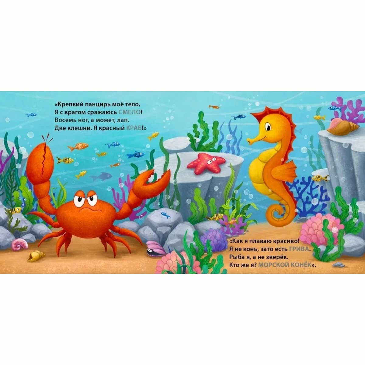 Мы похоже уже собрали все книжки-загадки из этой серии. Книга про водных жителей не менее красочная и познавательная. Основные обитатели водных и речных глубин здесь представлены. Очень классные иллюстрации. Книжки со стихотворениями (не загадками) мне не так нравятся (слишком мало и слишком просто). А с загадками очень оригинально. И быстро запоминаются наизусть.