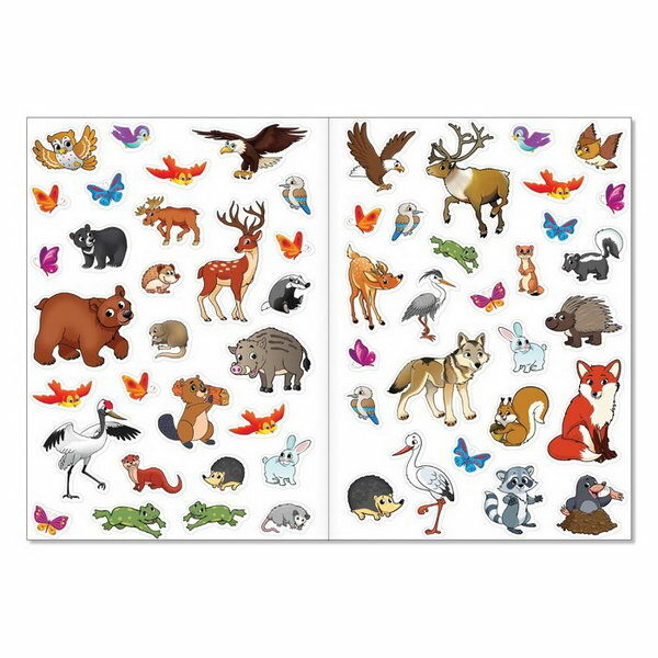 Мне очень нравится данная серия с наклейками, и эта книга - не исключение. Большой разворот с изображением леса и пустыми местами, куда необходимо наклеить наклейки. Причем силуэт на развороте позволяет безошибочно угадать, какое именно животное необходимо приклеить. Наклейки многоразовые, поэтому с легкостью можно играть по многу раз. Наклейки яркие, животные очень милые. Играть вместе с ребенком одно удовольствие.