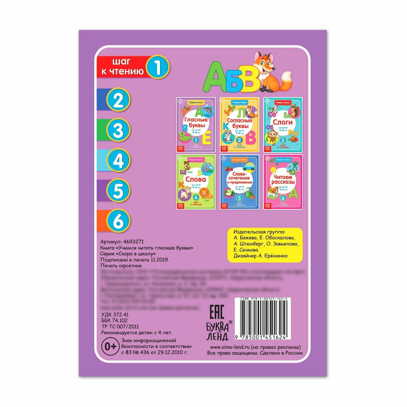 Сервис сравнения цен СкидкаГИД предлагает сравнить цены на товар «Книга: Учимся читать гласные буквы Для детей 4-6 лет 1 шаг к чтению (Нет автора); Буква-ленд, 2019»