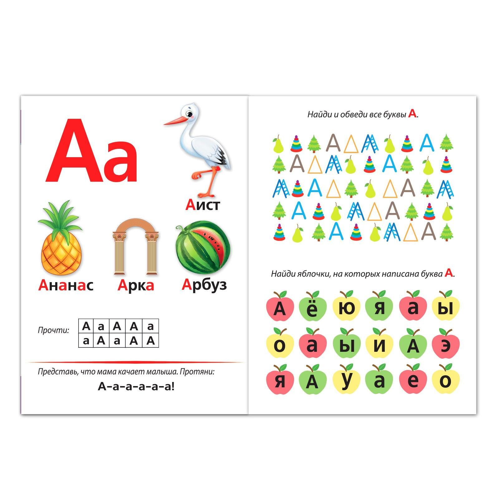 Несмотря на юный возраст нашего малыша, решили изучать буквы. На помощь нам пришла данная книжка. Удобный формат, яркие цвета, красивые картинки и крупные буквы. Гладкие листы, довольно-таки плотные. На развороте буква, место буквы в слове, дорожки для пения, а также задания на внимание, развитие фонематического слуха, петляющие дорожки. За 10 дней ребёнок легко запомнил все гласные буквы.