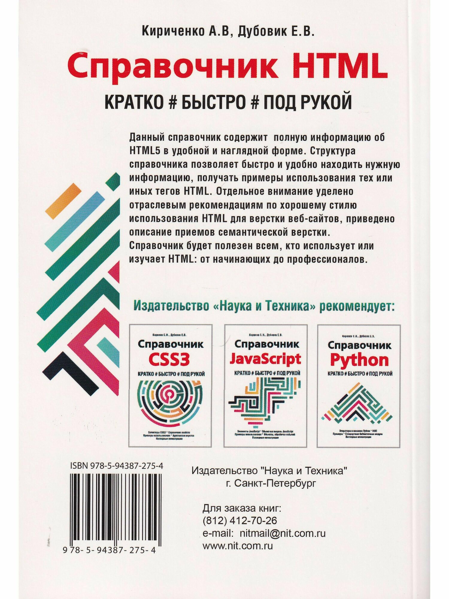 Справочник HTML Кратко быстро под рукой (Кириченко Андрей Валентинович; Дубовик Е. В.); Наука и Техника, 2021