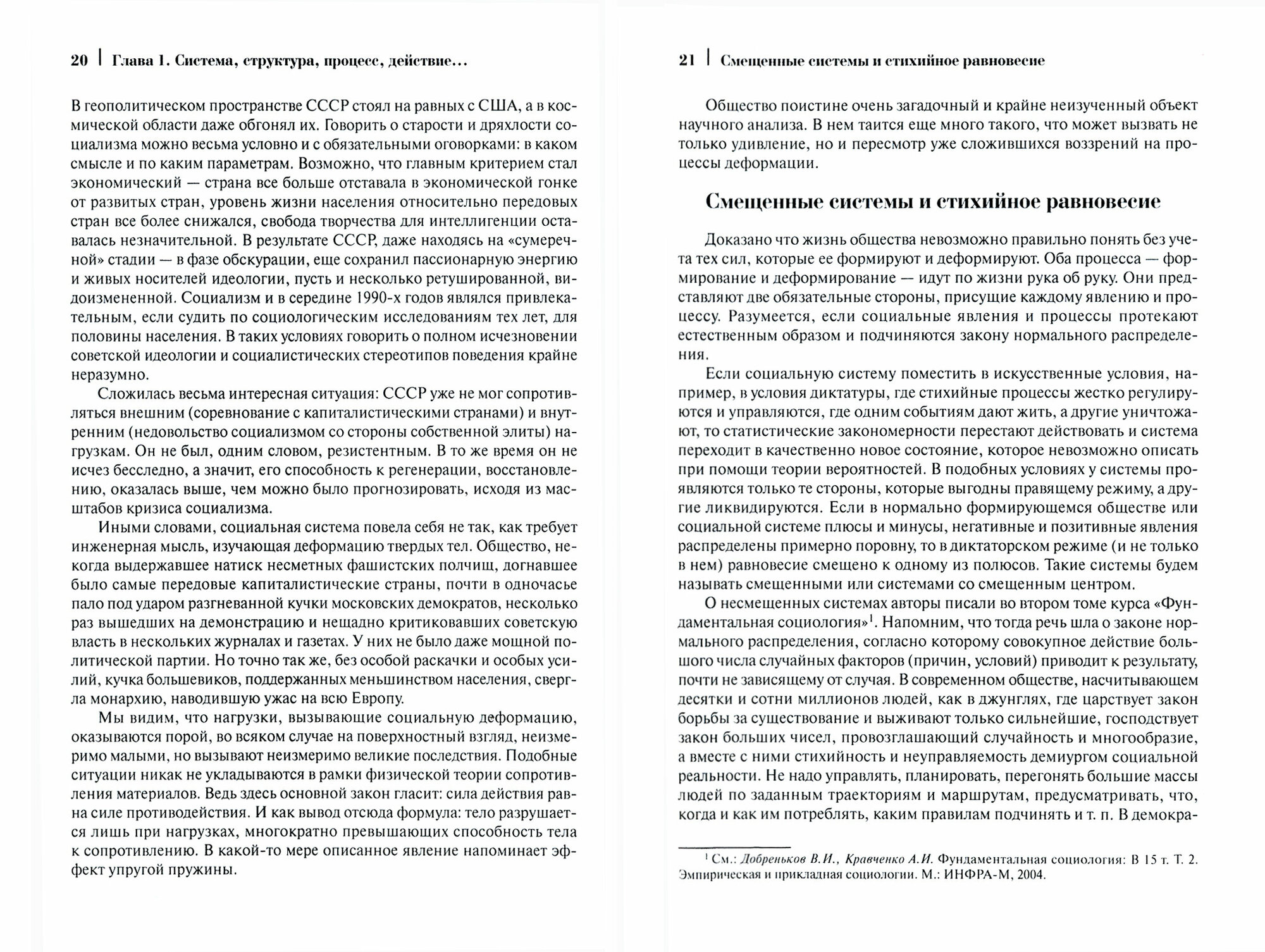 В монографии рассматриваются такие важные вопросы, как сущность социальной системы и структуры, виды социальных процессов и изменений, глобальные и локальные процессы, организация как социальная система и процесс, открытые и закрытые системы, общество как система (О. Конт), общество как целостный организм (эволюционная теория Г. Спенсера), социология как системный анализ "социальных фактов" (Э. Дюркгейм), общность и общество в учении Ф. Тённиса, статусно-классовая система общества М. Вебера, структурный функционализм Т. Парсонса, самореферентная и саморефлексивная система Н. Лумана, теория структурации Э. Гидденса, открытое и закрытое общество К. Поппера, теория социальных изменений П. Штомпки, полевая теория социального пространства П. Бурдье, статика и динамика формационной теории К. Маркса, глобализация и сетевое общество, теория конвергенции, теория постиндустриального общества, социология глобализации, теория модернизации, теория и практика периферийного капитализма, теория зависимости, мир-системный подход И. Валлерстайна, социальные деформации и трансформации, социальная аномия, бифуркация и опасность, социальная и духовная деградация, социальный хаос и социальная амбивалентность, кризисная динамика глобализации, катастрофа и революция, теория управляемого хаоса и экспорт демократии, синергетика и анализ сверхсложного социума, постнеклассическая наука как новый тип научной рациональности, общество риска У. Бека и Э. Гидденса, постмодернистская социология Ж. Бодрийяра, метанарративы и "десакрализация" научного знания Ж.-Ф. Лиотара, теория сетевого общества М. Кастельса, постмодерный этап развития незападной социологии.