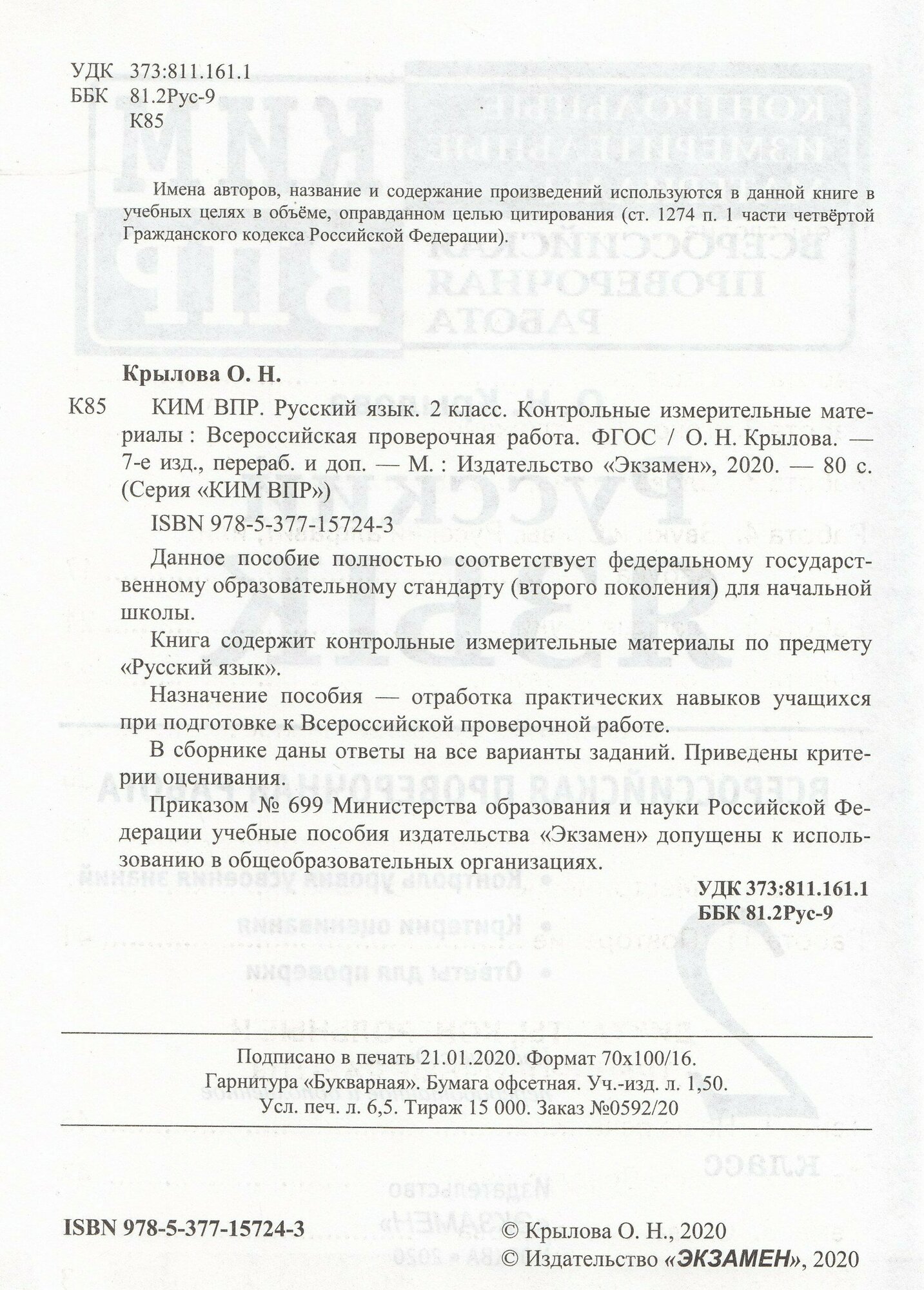 КИМ ВПР. Русский язык. 2 класс. Контрольные измерительные материалы. Всероссийская проверочная работа. ФГОС. Крылова О. Н.Данное пособие полностью соответствует федеральному государственному образовательному стандарту (второго поколения) для начальной школы.Книга содержит контрольные измерительные материалы по предмету "Русский язык".Назначение пособия - отработка практических навыков учащихся при подготовке к Всероссийской проверочной работе.В сборнике даны ответы на все варианты заданий. Приведены критерии оценивания.