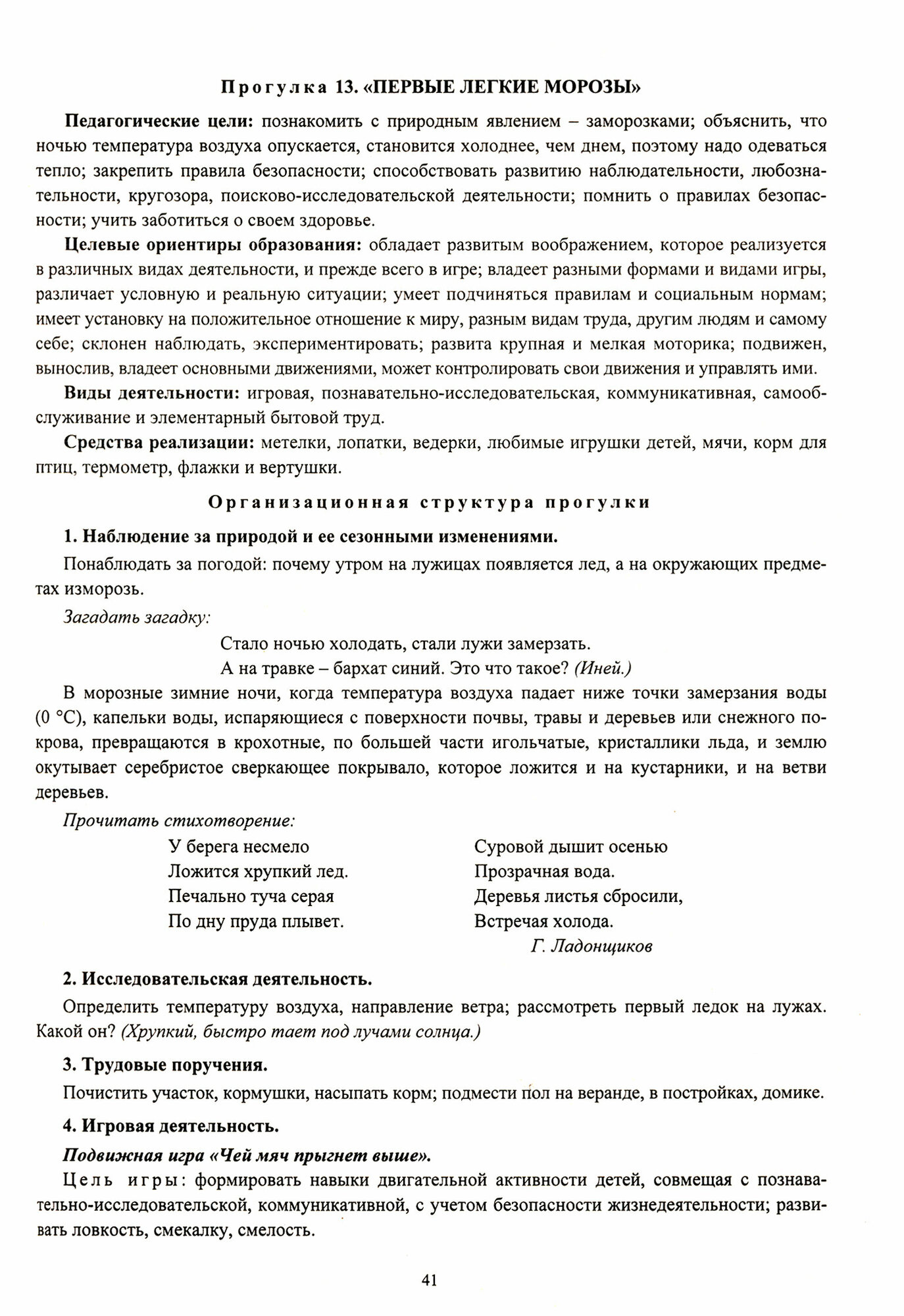 В конспектах каждой прогулки сформулированы педагогические цели; определены планируемые результаты - целевые ориентиры образования; раскрыта деятельность детей в таких видах, как игровая, коммуникативная, исследовательская, трудовая; предложен набор средств, позволяющих педагогам развивать познавательные, речевые и практические умения у старших дошкольников в процессе ознакомления с объектами и явлениями природы, формировать первичные представления о себе и других людях при освоении содержания образовательных областей "Познавательное развитие", "Социально-коммуникативное развитие", "Художественно-эстетическое развитие", "Речевое развитие", "Физическое развитие".