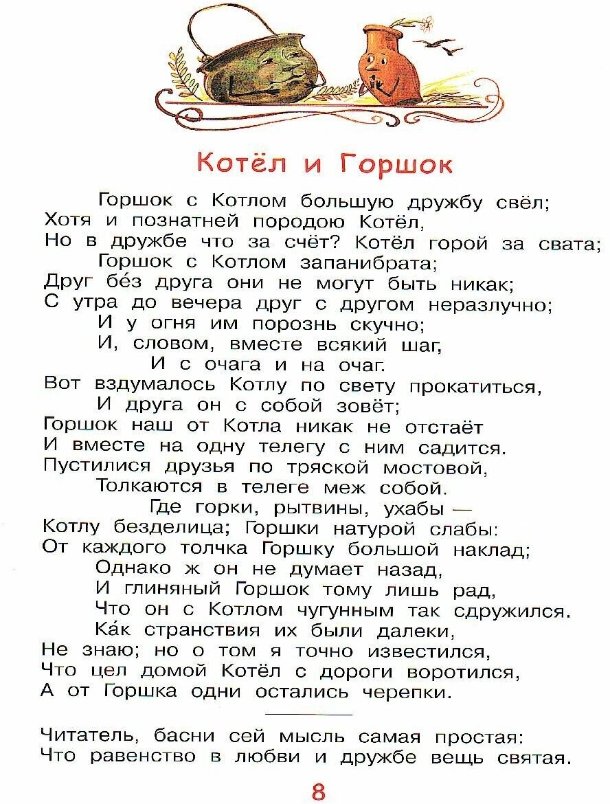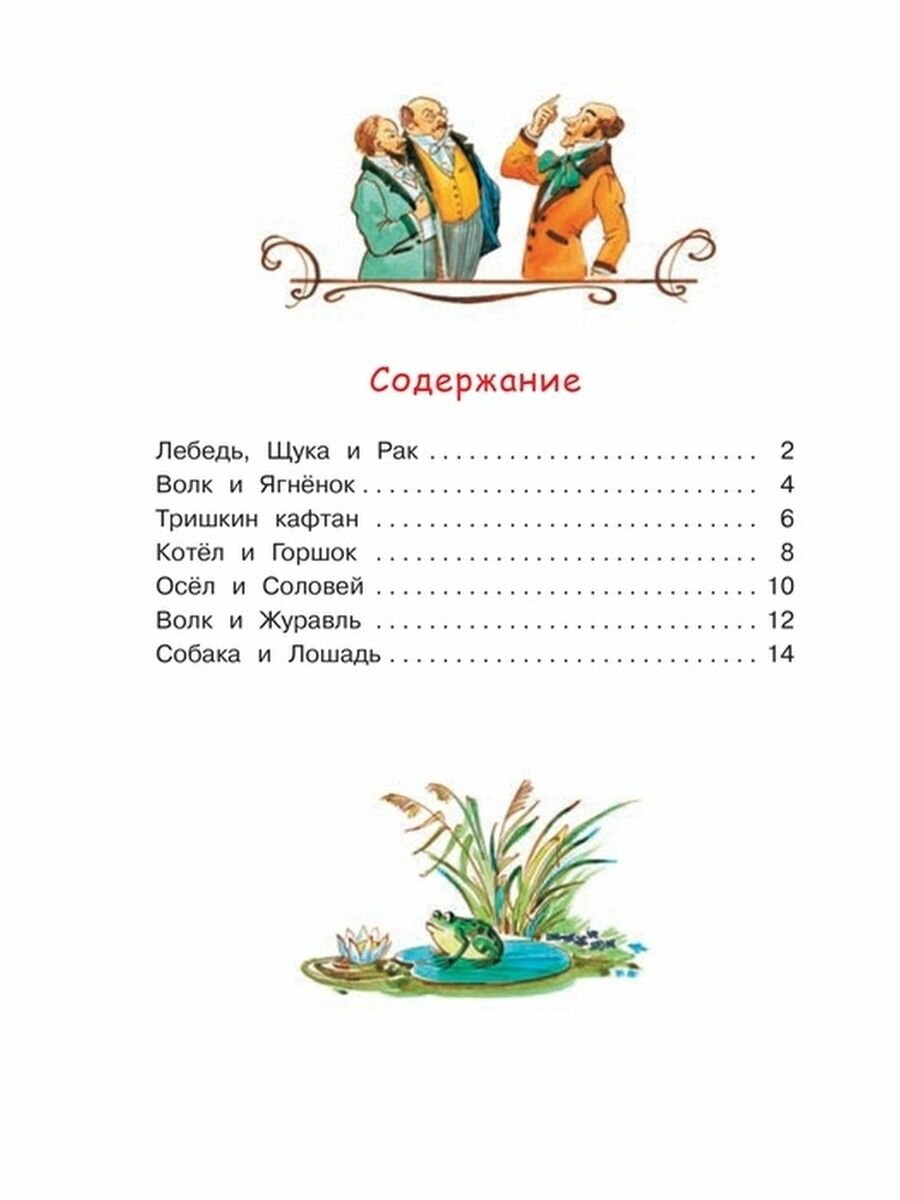 Брошюра включает в себя 7 басен Ивана Крылова и открывается знаменитой басней «Лебедь, Щука и Рак» смысл которой заключается в том, что, нужно уметь договариваться с товарищами, когда принимаешься за общее дело и найти место каждому по его талантам.