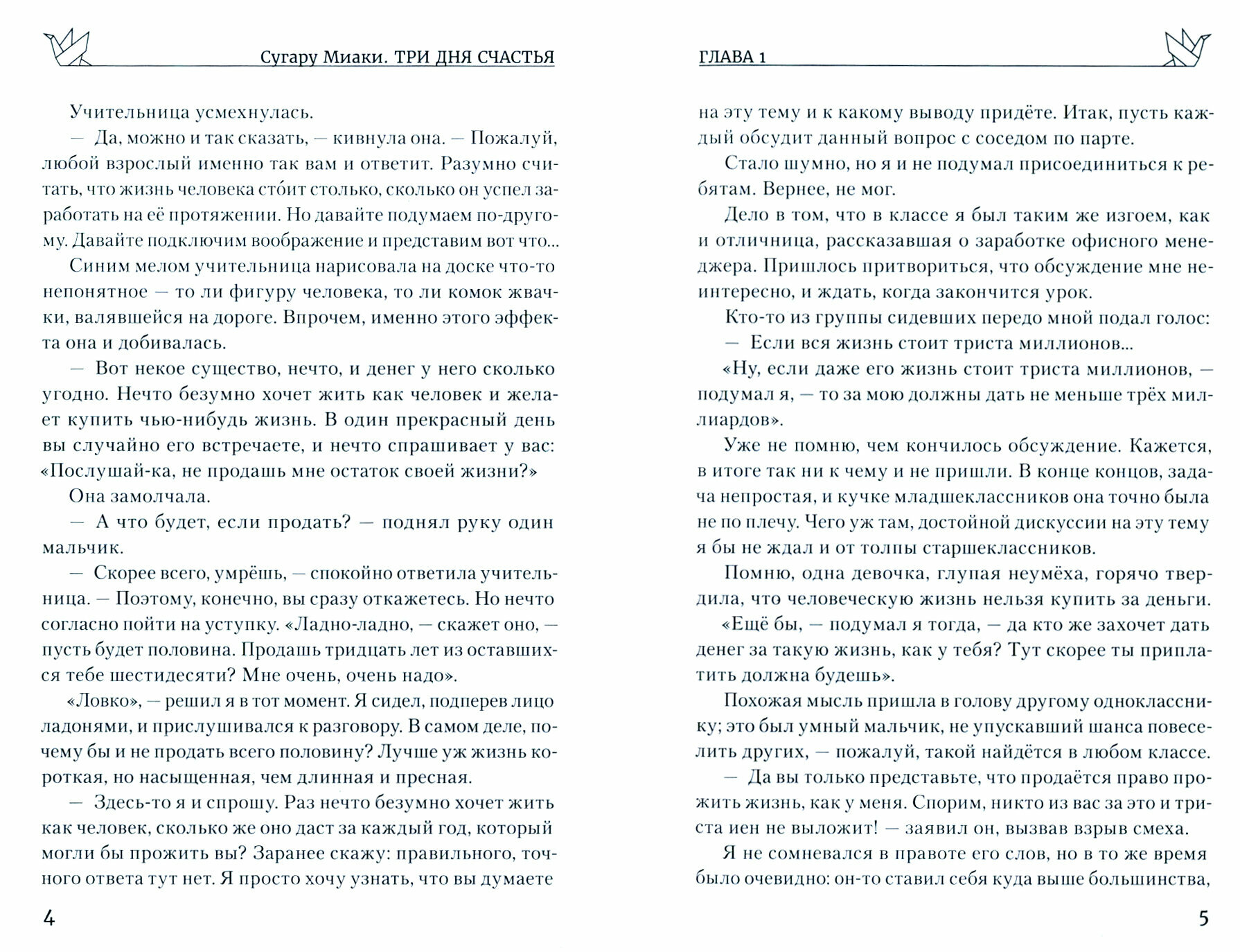 Главный герой \"Трёх дней счастья\" - Кусуноки - когда-то был жизнерадостным парнишкой, искренне влюблённым в жизнь. Но вот годы пролетели и он столкнулся с этой самой жизнью в её истинном \"обличии\". По учёбе завалы, на работе получаешь копейки, а смысла в дальнейшем существовании не очень-то много - слушать музыку, читать книги и выскребать остатки своих сбережений, чтобы протянуть ещё день-другой. Но, в один день, он узнаёт, что можно разменять предначертанные годы бренного существования на деньги. Казалось бы, что может пойти не так?