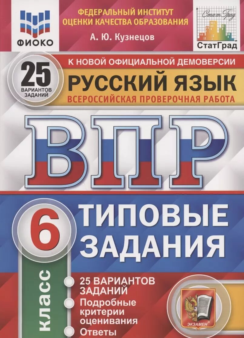 Русский язык Всероссийская проверочная работа 6 класс Типовые задания 25 вариантов заданий Подробные критерии оценивания Ответы (Андрей Юрьевич Кузнецов); Экзамен, 2022