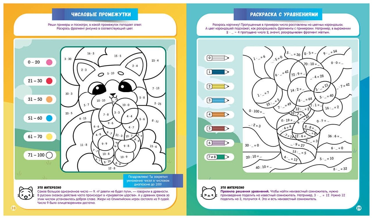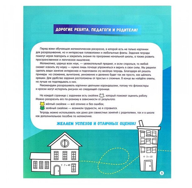 «Математическая раскраска» — настоящее спасение для школьников и их родителей, если ребенок не успевает по математике или ему неинтересно. Выполняя увлекательные задания и раскрашивая картинки, школьник сам не заметит, как освоит арифметические действия и научится считать без ошибок. А любопытные факты на каждой странице сделают занятия еще веселее! Как работать с пособием: В выбранном задании нужно решить пример, затем раскрасить фрагмент картинки соответствующим ответу цветом, и, если удастся решить всё задание правильно, получится красивая картинка. Проверить себя можно по ответам в конце тетради, а оценить свою работу — раскрасив смайлик внизу страницы.