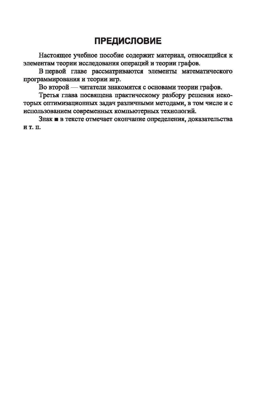 Книга включает в себя три главы. В первой рассматриваются вопросы, связанные с линейным и нелинейным программированием, а также теория матричных игр. Во второй приводятся основные положения теории графов. И, наконец, в третьей рассматриваются различные варианты решения задач на вышеуказанные темы с применением современных информационных технологий (пакеты MATLAB, Mathcad, табличный процессор Excel).