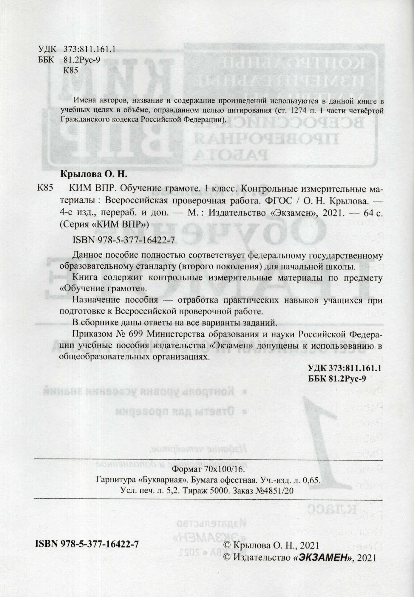 Книга: Обучение грамоте 1 класс (Крылова Ольга Николаевна); Экзамен, 2021