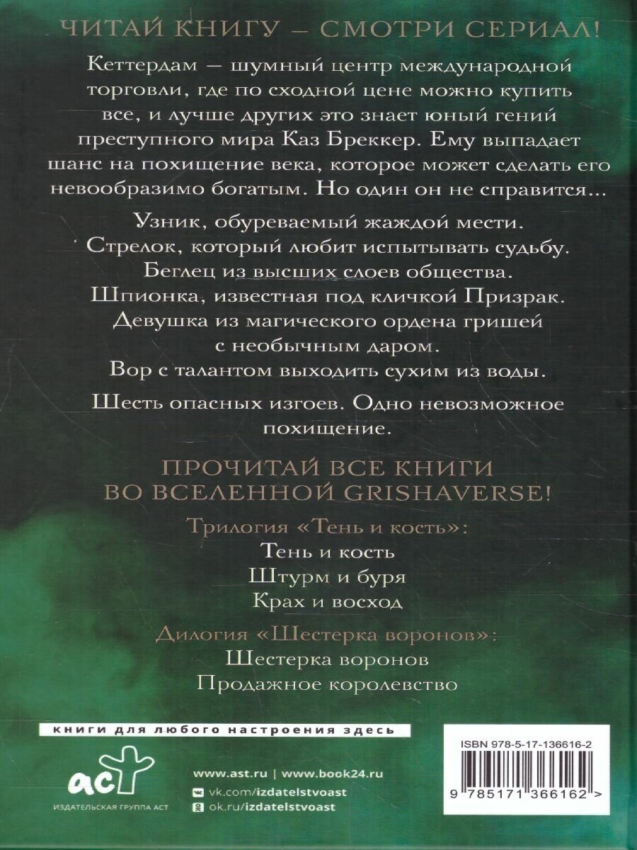 Узник, обуреваемый жаждой мести. Стрелок, который любит испытывать судьбу. Беглец из высших слоев общества. Шпионка, известная под кличкой Призрак. Девушка из магического ордена гришей с необычным даром. Вор с талантом выходить сухим из воды.