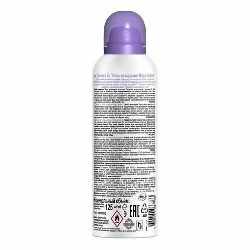 Спрей дезодорант детский Deonica Magic Splash 125 мл. Средство от пота с гипоаллергенной формулой, разработанной специально для детей от 8 лет. Средство от запаха содержит натуральный абсорбент (Микронизированный бамбук) , который защищает от неприятного запаха и влаги, не блокирует поры, позволяя коже дышать. Дезодорант для детей Деоника не приводит к дисфункции потовых желез, не раздражает кожу, эффективно защищает от неприятных запахов до 24 часов, не оставляет белых следов, не содержит солей алюминия, не содержит спирта, не содержит парабенов и фталатов, одобрен дерматологами. Дезодорант от запаха одобрен дерматологами. Рецептуры всех дезодорантов Deonica разработаны в Швейцарии. Высокая эффективность Средства от пота под мышками подтверждена клиническими испытаниями и потребительскими тестами.