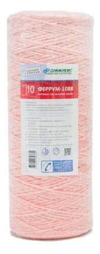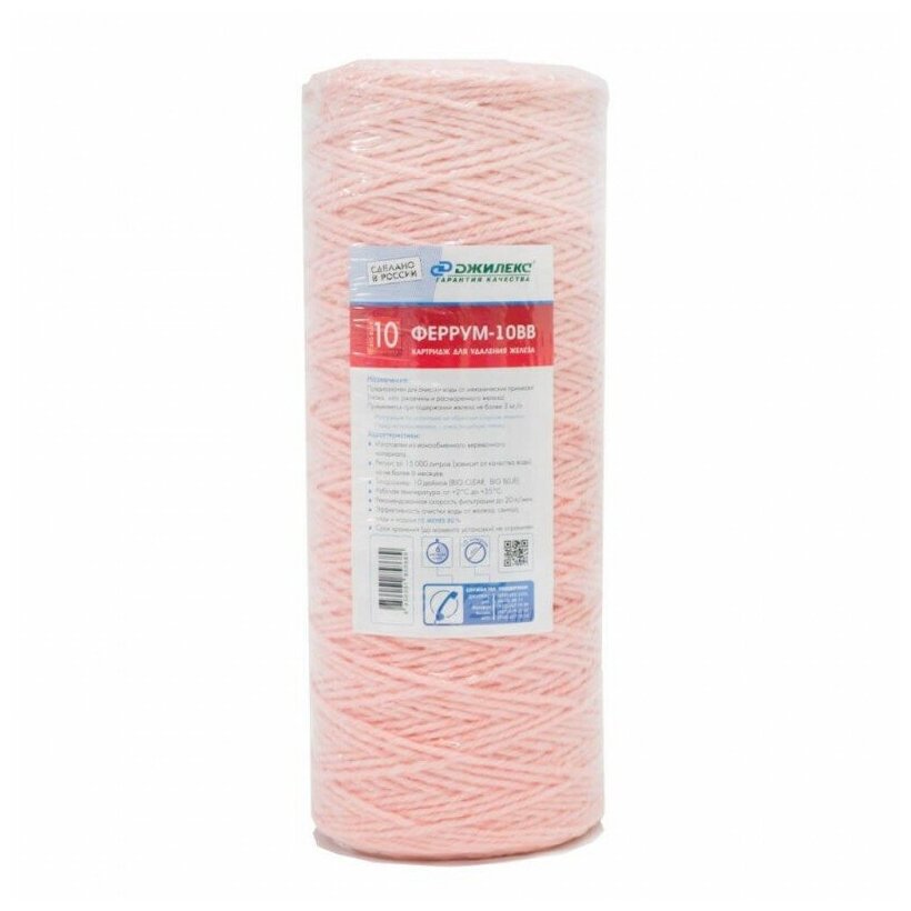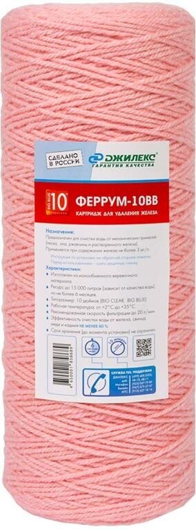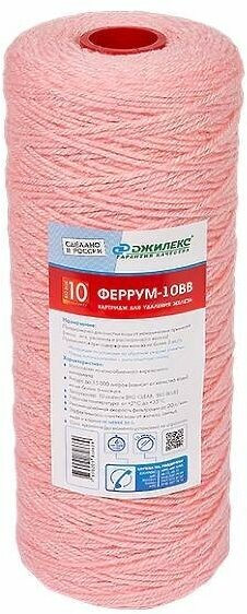 Картридж для очистки воды Джилекс Феррум - 10 ББ - веревочный картридж для удаления железа и механических загрязнений. Пористость 10 мкр. Вес 650 грамм. Типоразмер 10 ВВ. Ресурс до 15 000 литров (зависит от качества воды), но не более 6 месяцев.