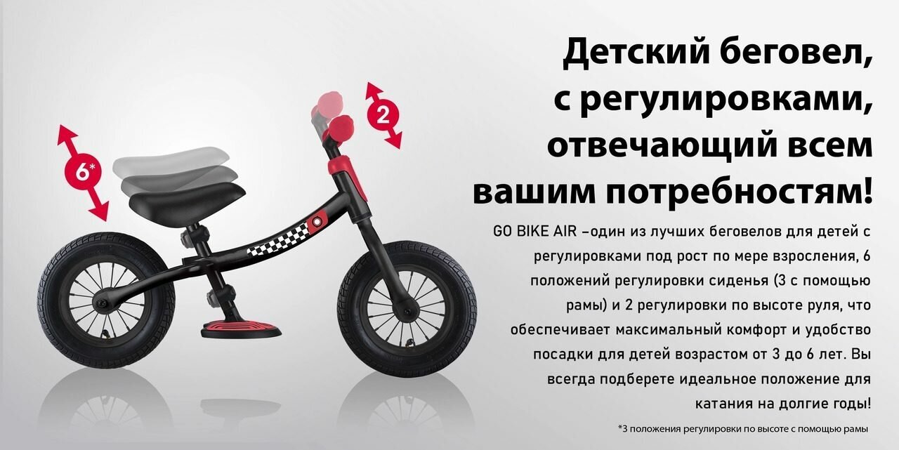 GO BIKE AIR детский беговел для детей в возрасте от 2-х лет с регулируемой рамой, позволяющей менять размер из низкого положения в высокое положение рамы, предлагая еще большую универсальность продукта по мере роста и развития двигательных навыков вашего малыша.